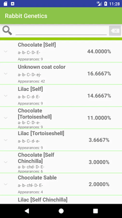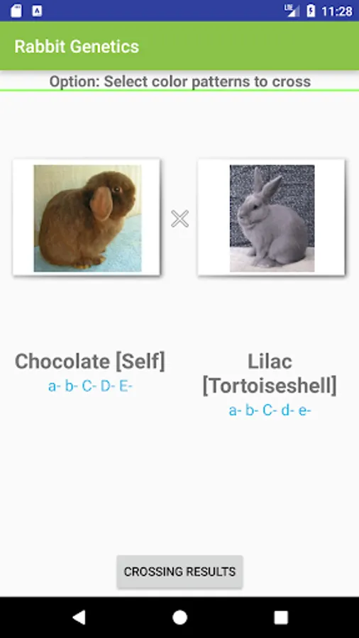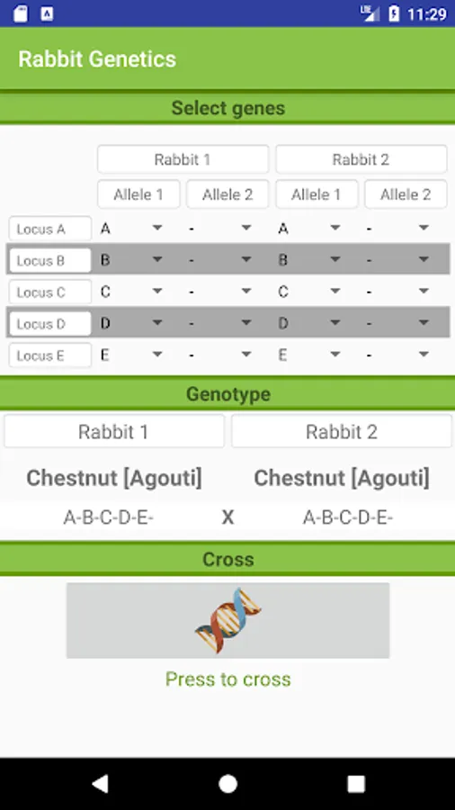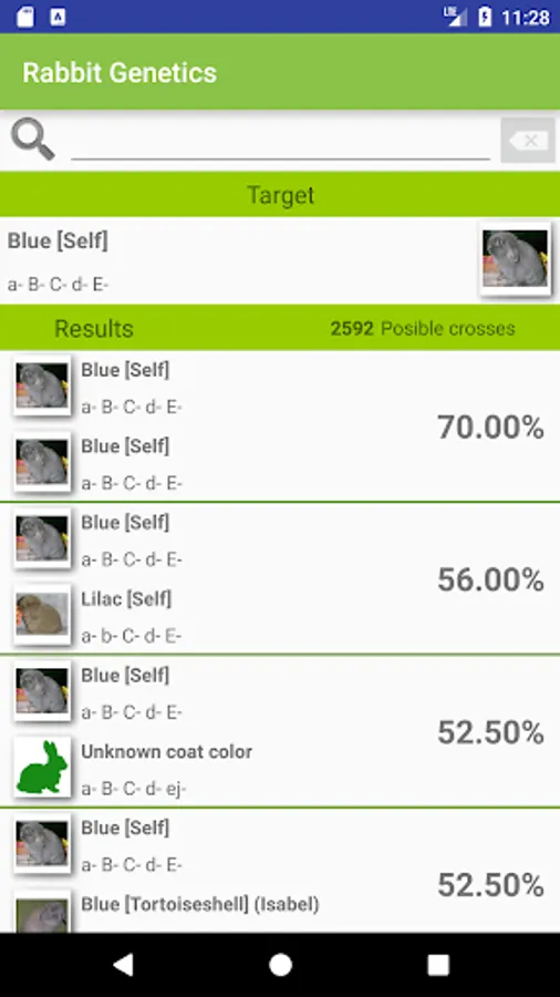 - A genetic calculator that allows us to select the combination of genes we want from two rabbits and cross it to see the possible combinations result with their probabilities. The 5 most representative genes (A, B, C, D, E) are being taken into account for all calculations, these calculations can be performed even if the genes are unknown.