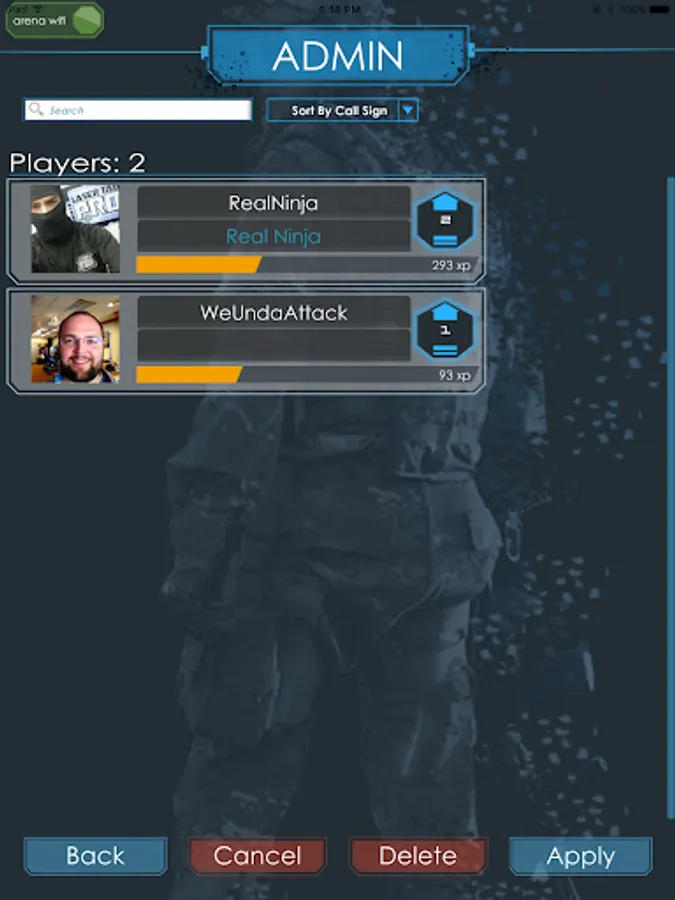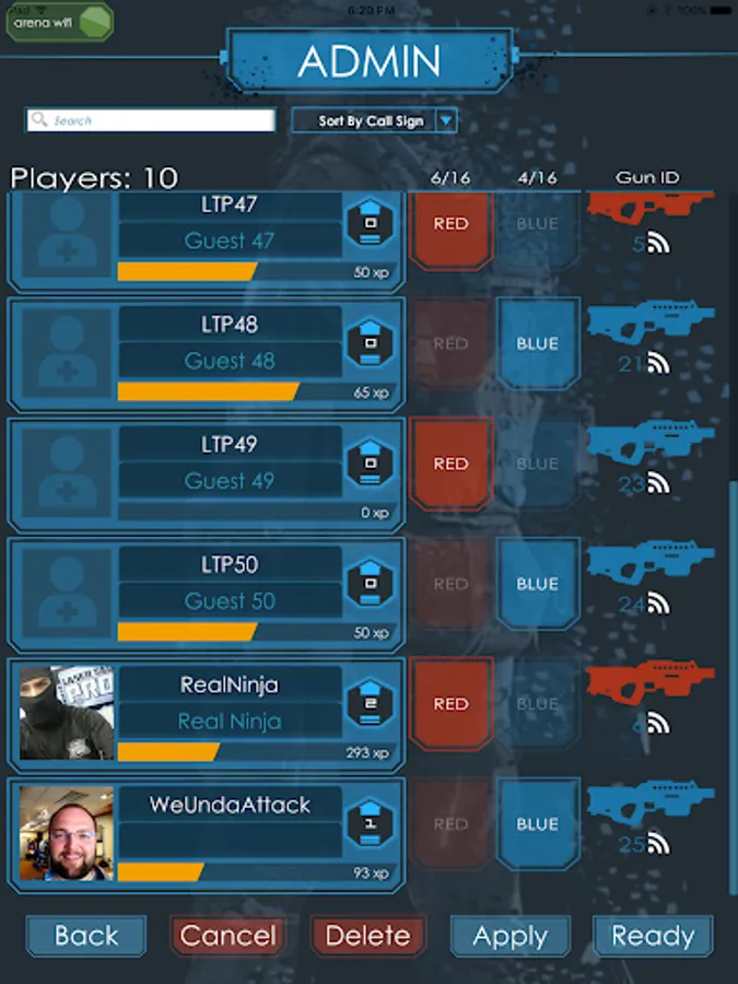 The app also provides a gateway for game coordinators to assign players to teams and keep their operation organized. Logging in with Administrator credentials provides access to the player assignment screen where CallSigns and games are managed. The app provides mobile administrative control for operators who need to move about the arena during gameplay.