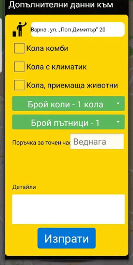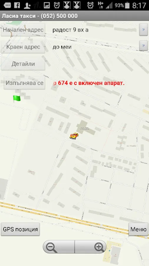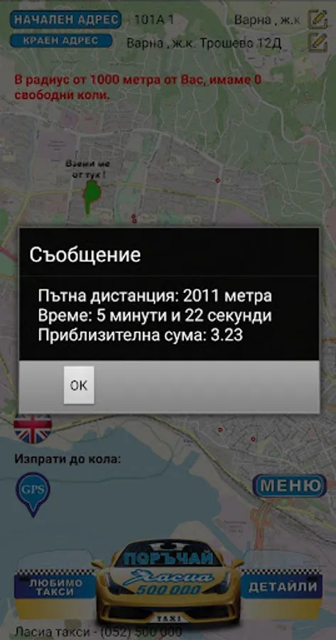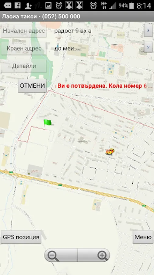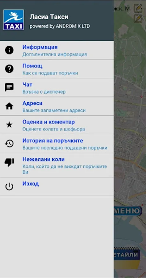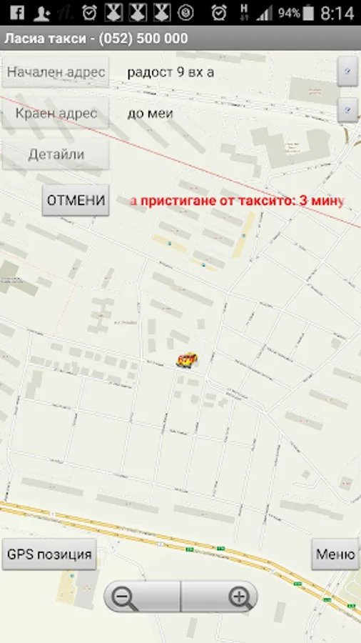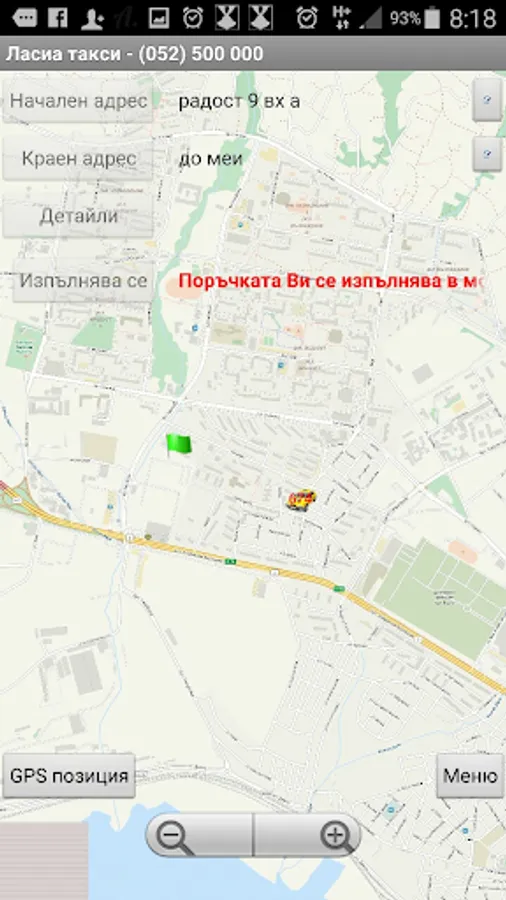 Ordering a taxi with only two buttons !!! Your order is accepted and processed by our dispatchers, then you see what is your taxes where they are in coin, how long will it to you and how it comes to you. When placing the order, you can select different requirements such as the car passes a dirt road, carry zhivitni to has a large trunk or station wagon and a bunch of others. You can also write directly to our dispatchers via our chat system in real time.