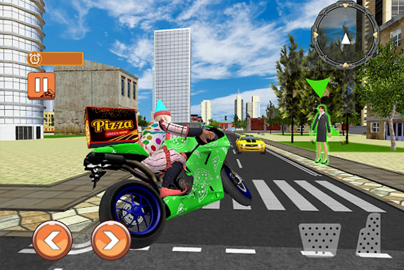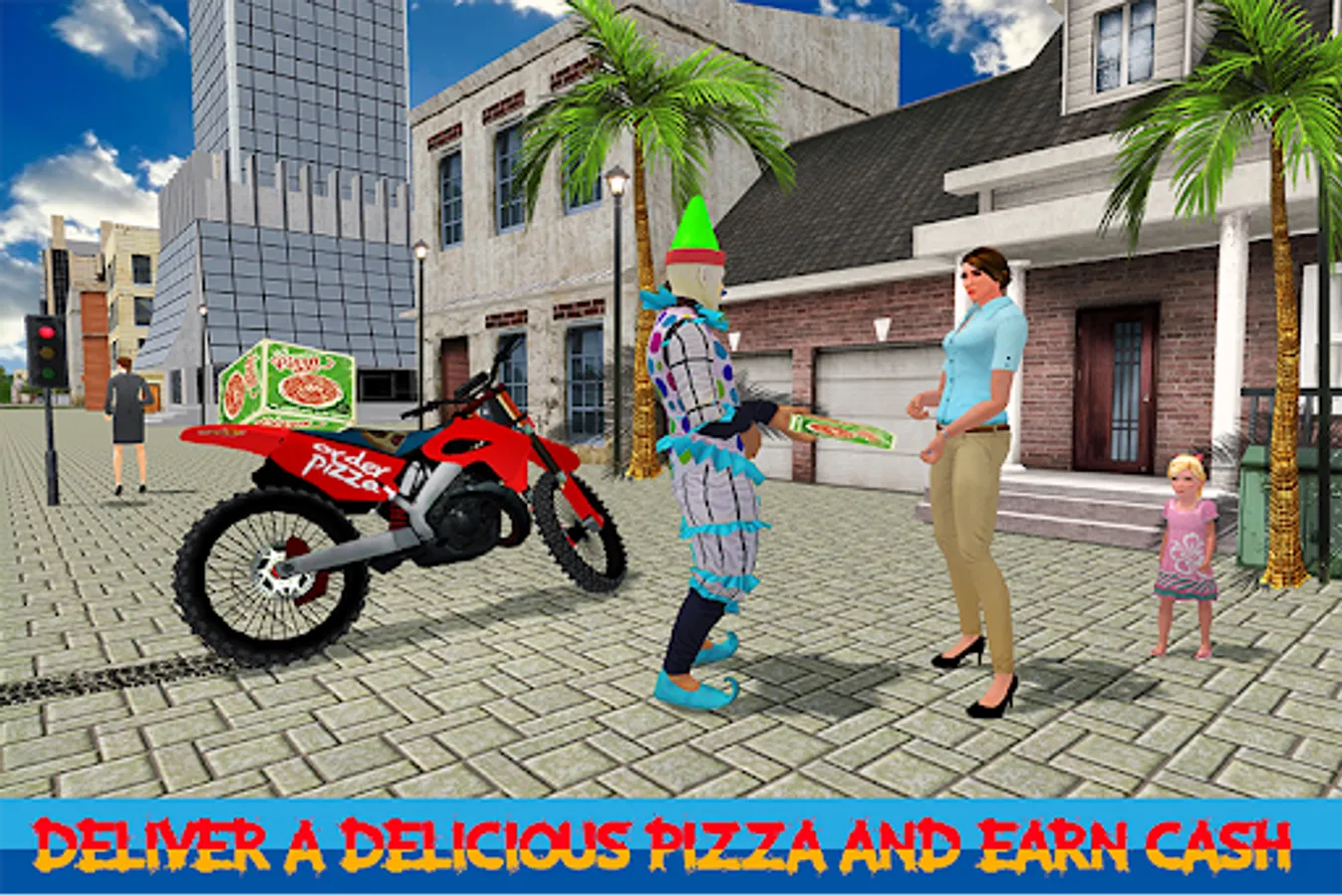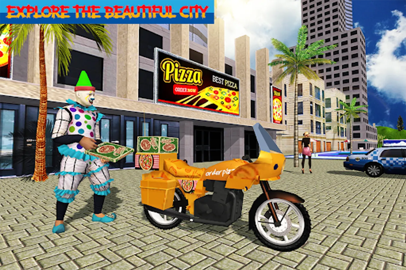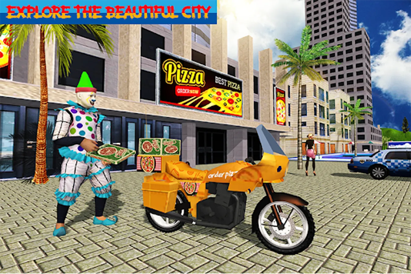 • Play the role of clown pizza delivery boy in the city