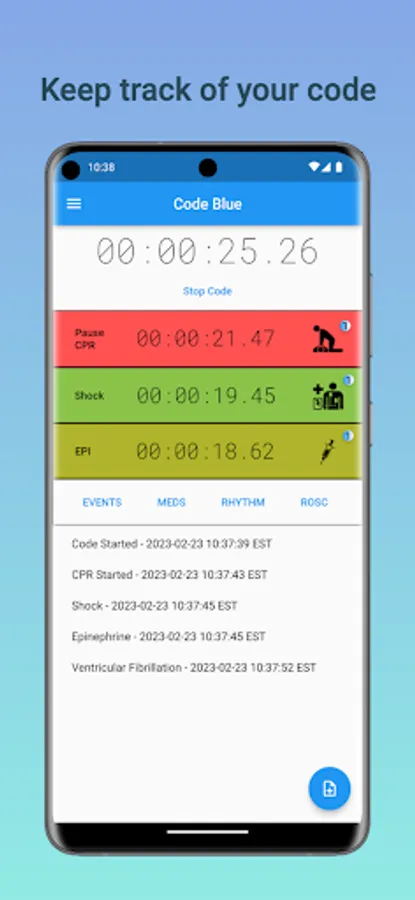 Code Blue is a specialized stopwatch application that allows you to record the actions that take place during a cardiopulmonary event.
