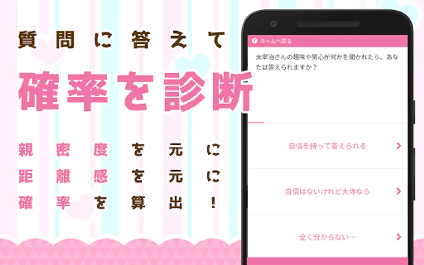 "Diplomatable degree diagnosis" is romance diagnosis application that calculates the probability of being associated with that adult only by answering questions of 20 random questions. Since it is the current probability, bad results are also negative strict prohibition ♪ How can future possibilities to go out, please also refer to support comments (* ^^ *) ♪ Let's coordinate your romance at once ♪ Koisuru girl Also a boy in love , with that person you care about, your boyfriend, become her! !
