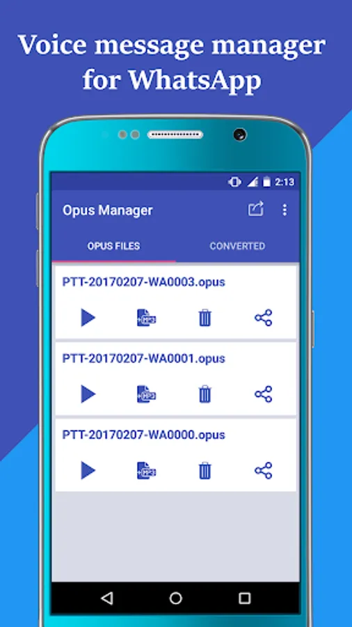 OPUS audio converte r will help you to convert your WhatsApp voice note into mp3 file. You can also make your own Gif using videos which you can share into your social messages. You can make new audio output for your music player through this audio app. This opus file converter will help you to make a high quality mp3 file from your opus files send through WhatsApp and other social media sites. This music manager will help you to play and delete all opus files in your mobile phone. Music converter feature help you to convert the file into mp3 format. It will help you to use the file in different audio recorder apps which are using wav format. You can use this opus converter if you are an audio compressor or an audio mixer.