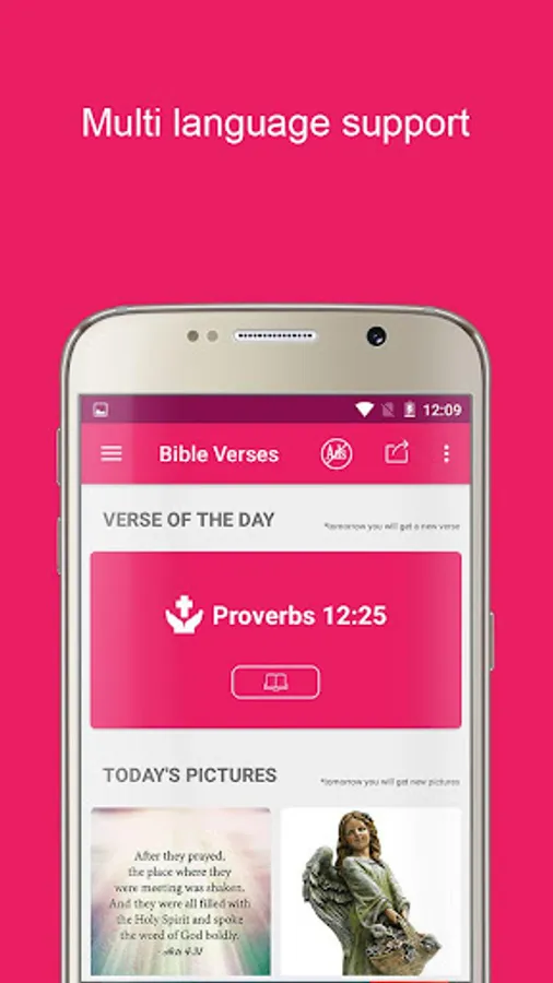 - Multi – Language support with English Bible, French Bible, Spanish Bible, German and other language Bible Verses.
