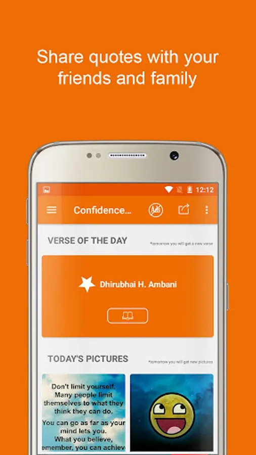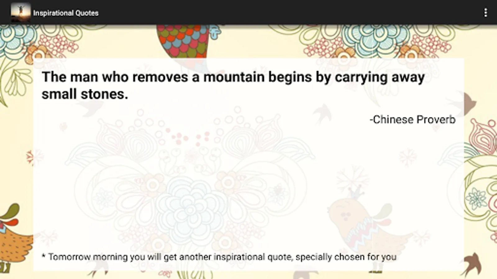 Daily inspiration quote app give one motivational quotes for success in the morning. A lot of life motivation thought are here in your daily motivation app. Positive quotes daily boost mental strength and depression recovery. Be positive attitude is the way to success tips. You will get positive life thoughts through these self esteem quotes. Encourage yourself with inspirational words and success quotes. Enjoy the power of positive thinking step to success mantra through inspirational apps. You will get one daily motivational and inspirational quotes through this inspiring apps. A lot of daily inspiring quotes for success are here. Inspiring and positive quotes are inspirational lessons for you. Words of wisdom and inspiration quotations are the key to success thoughts. This inspirational thoughts everyday app will give inspirational good morning quotes with messages. Inspirational stories of great personalities and motivational videos are the best way for positive thoughts. Daily motivational quotes for success have these positive mantra and confidence booster. We read lot of inspiring books and motivational poems to develop these motivational tips. Enjoy these confidence building tips and inspirational messages through our encourage and motivation widgets. Learn winning competition success in life through self inspiring thoughts and success stories. Watch inspirational videos and inspiring short stories for extra strength in your life. Motivational images and inspirational picture quotes are a great source of strength. Develop inspirational theme with motivational pics and inspiring poems. You can also enjoy inspiring girly qutoes to make female inspiration wallpaper. Start reading a lot of motivation books and inspiration picture.