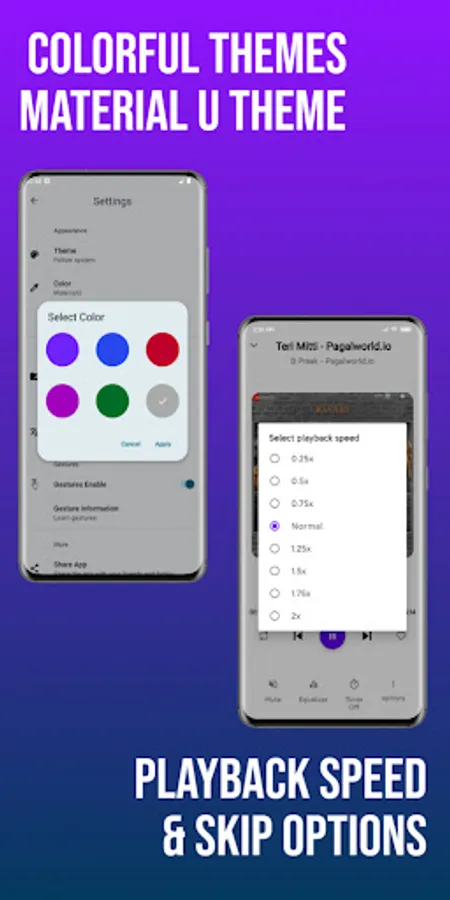 The app contains 5 colorful themes material purple, material blue, material red, material pink, material green and also light and dark and material U themes.