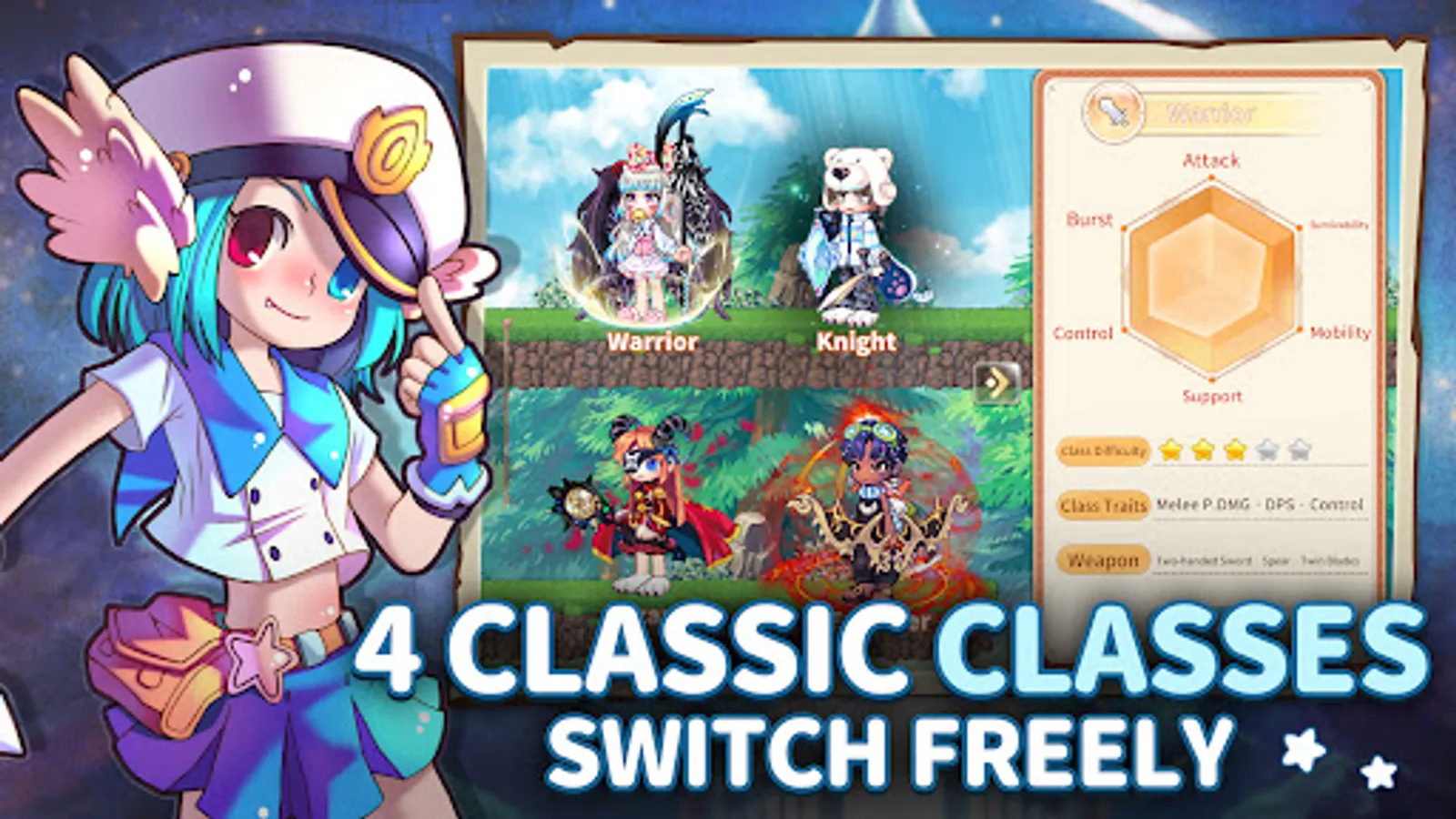 Remember the good old days? We've brought back the four iconic classes you know and love – Warrior, Explorer, Knight, and Wizard, each with 2~3 different kind of weapons to match. Now team up to challenge the classic Bosses!