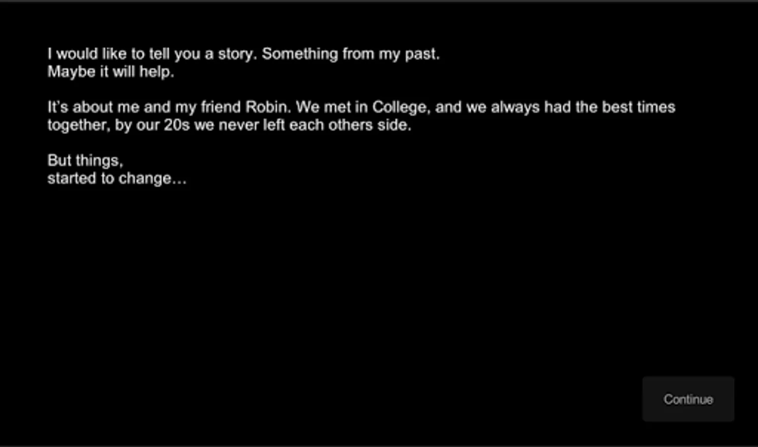 The first chapter of the tale is between two friends, Sean and Robin, and their journey through depression.