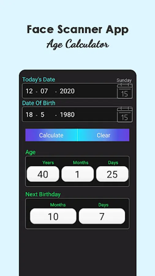 Age Calculator by Date of Birth you can also calculate the remaining days of your next upcoming birthday or any anniversary.