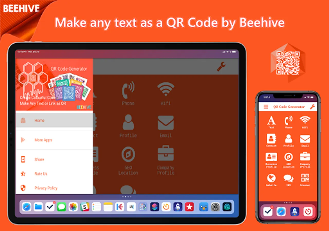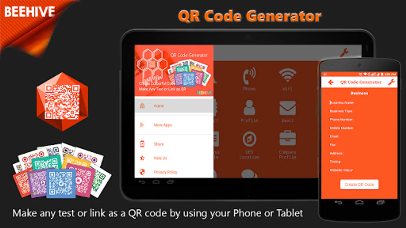 QR Code Generator & Creator By Beehive is a simple and convenient tool that help you create QR Code image displayed on the screen. Several content types are supported, include Text, SMS, Url, Email, Phone number, Contact, Geolocation, Buisness Profile, Your Profile etc.