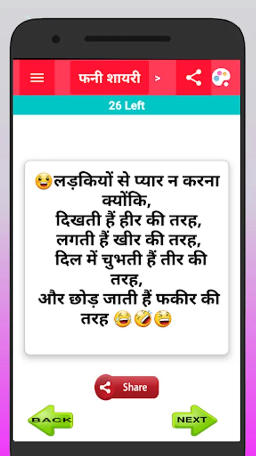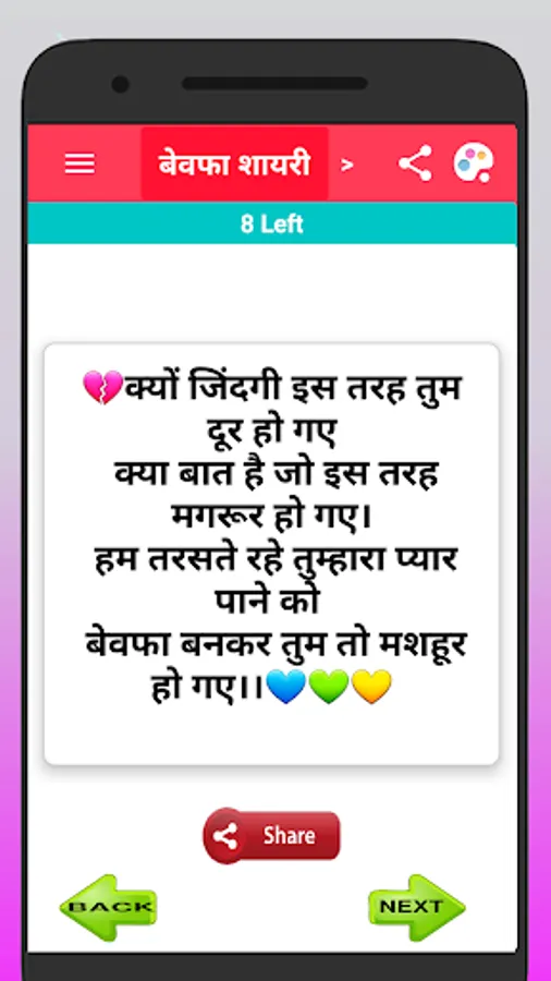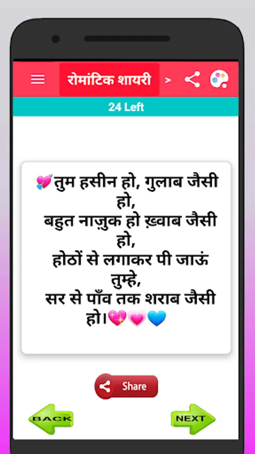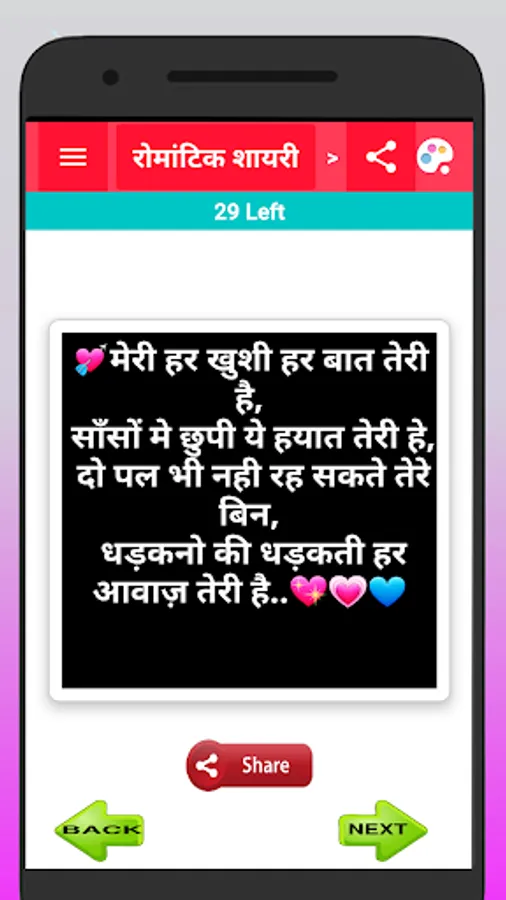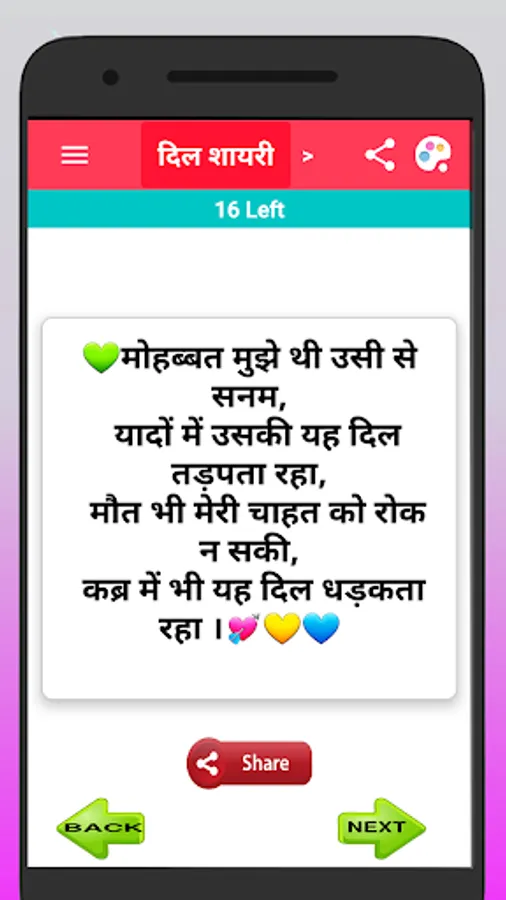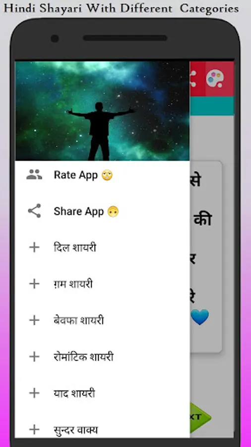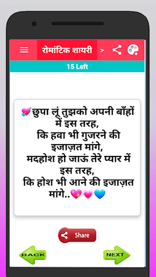 इस ऐप में विभिन्न श्रेणियां शायरी उपलब्ध हैं