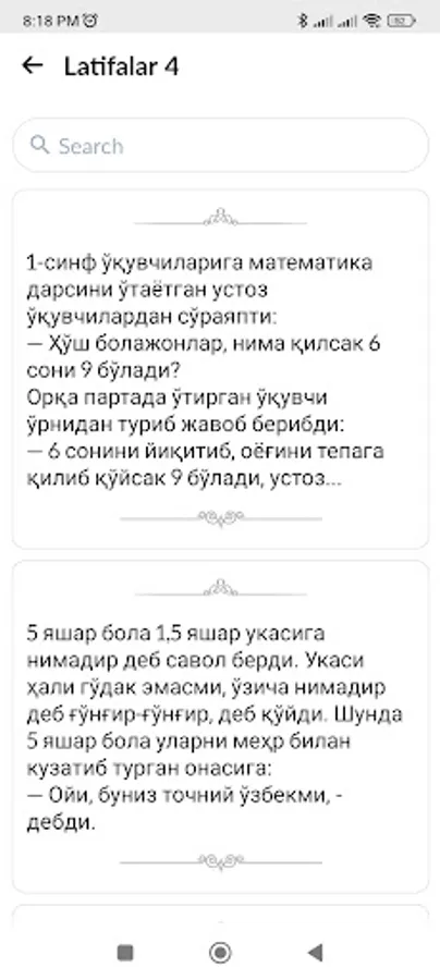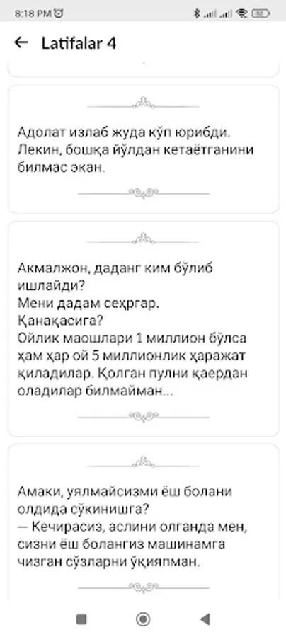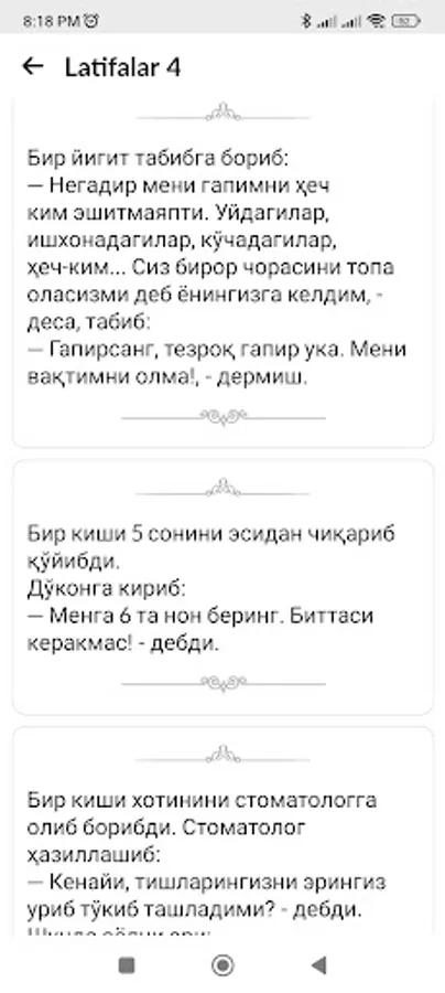 Anekdotlar to'plami esda qolarli, qiziqarli va o'ylantiruvchi hikoyalar uchun asosiy manbadir. Kulishni, yig'lashni yoki hayot sirlari haqida o'ylashni xohlaysizmi, bizning latifalar to'plamimiz sizni mamnun qiladi.