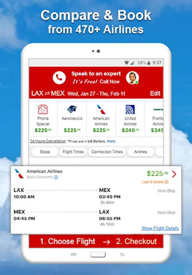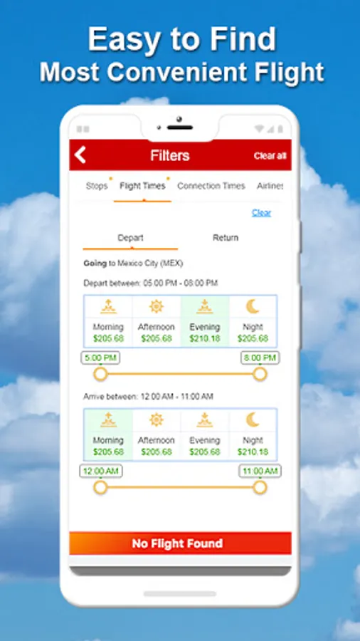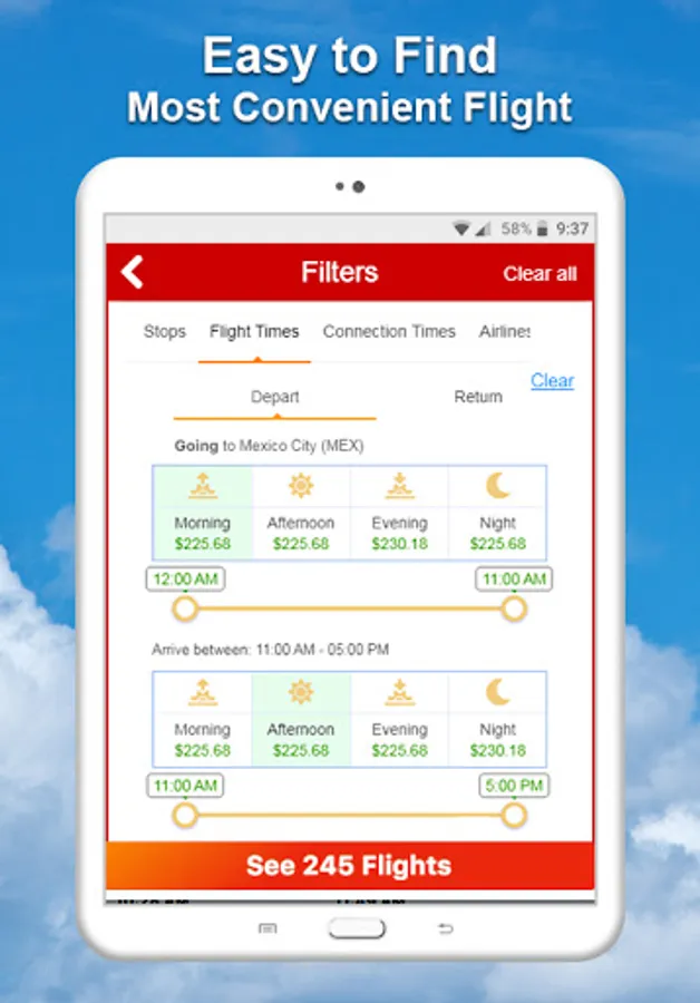 - State-of-the-art search filter that sorts flights that fit your price range & meet your preference for airport, airlines, number of stops, and flight timings.
