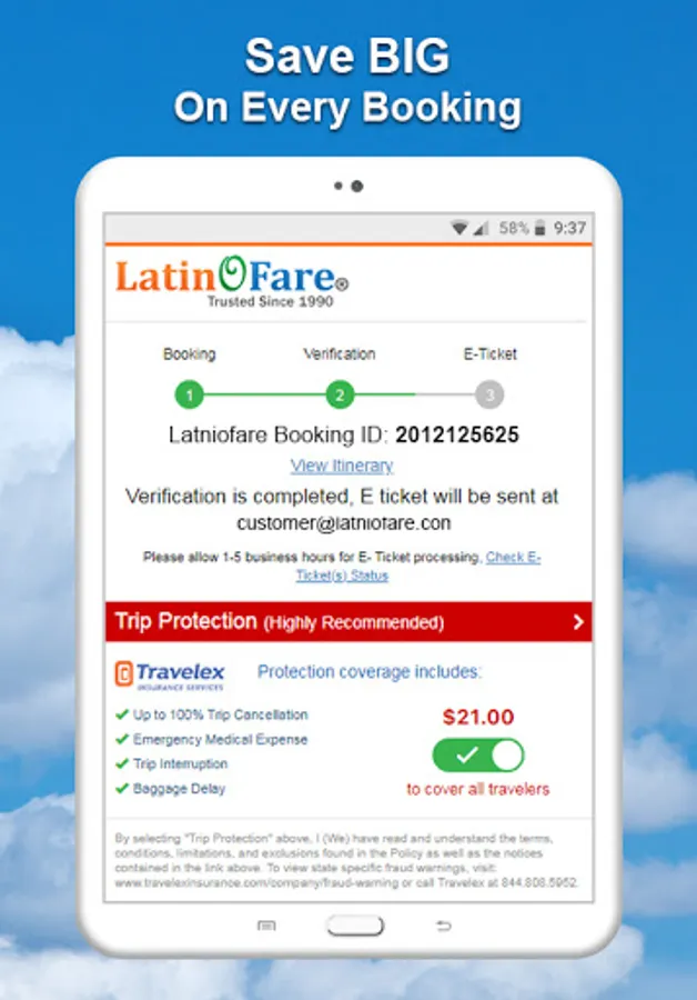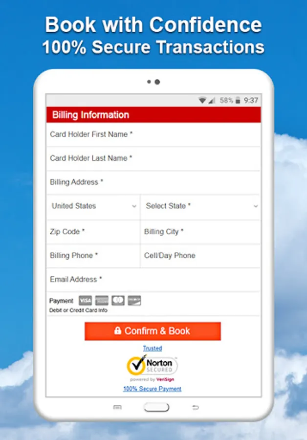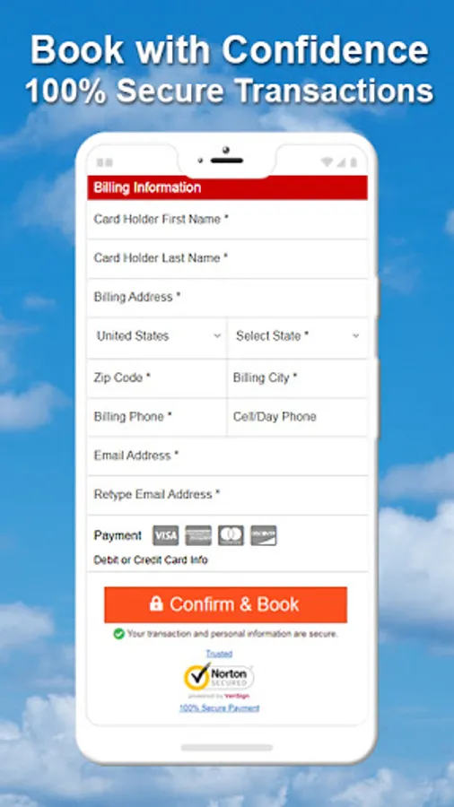 Our customers can search for cheap flights, check availability, and buy airline tickets 100% safely and securely on our VeriSign Certified App. We use the latest encryption technology to protect our customer's valuable information.
