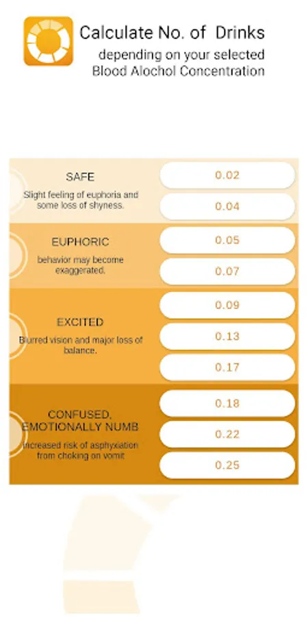 Calculates the Estimated number of Drinks based on your selected Blood Alcohol Content.