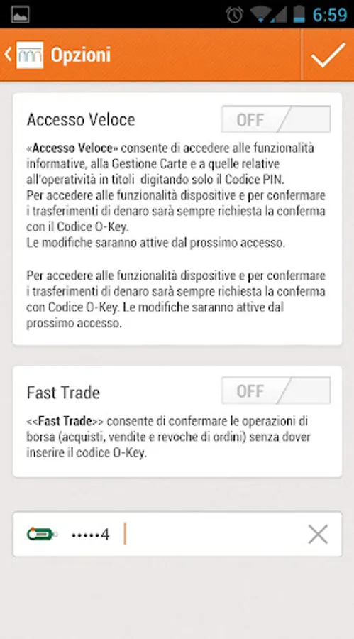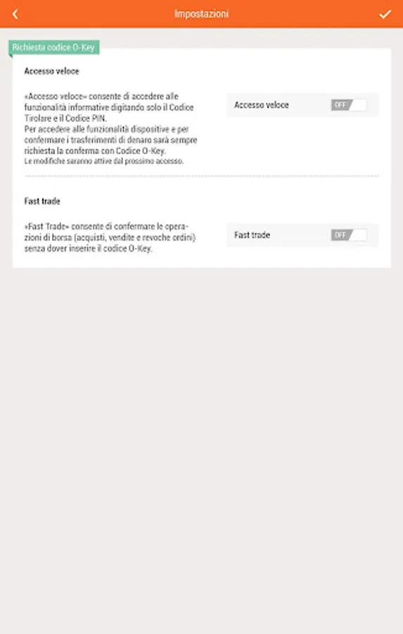 - quick access, which allows you to use the information functions without having to enter the O-Key code; in case of fast access activated, the transaction transactions are always protected by the O-Key code (unless Fast Trade is activated) and the personal data partially hidden by asterisks;