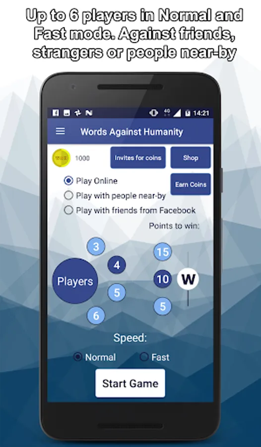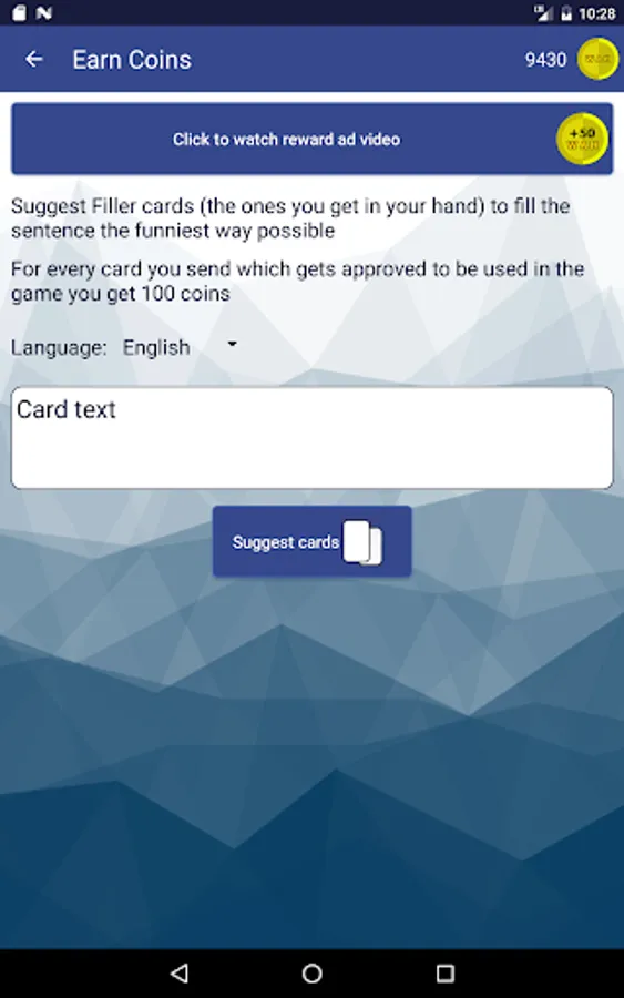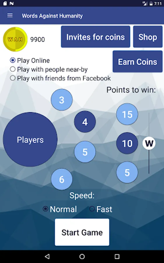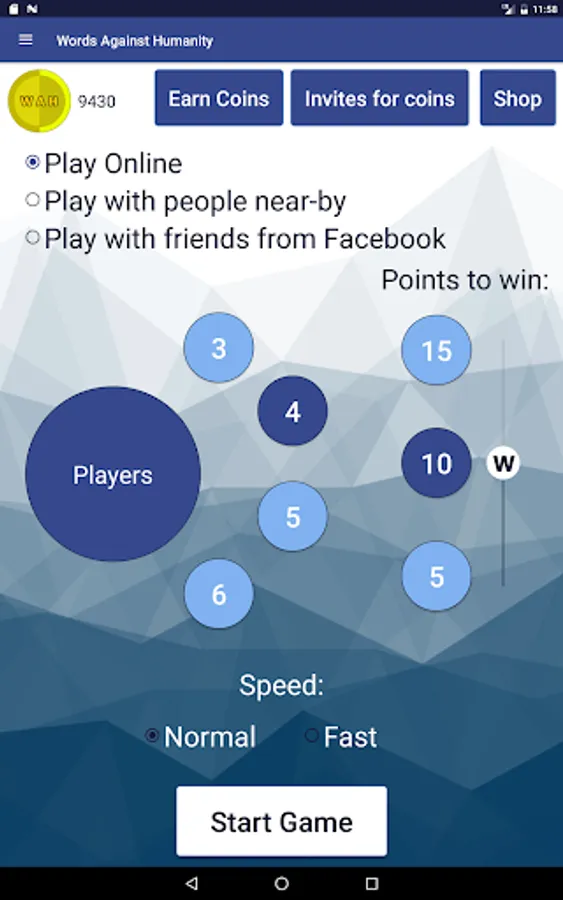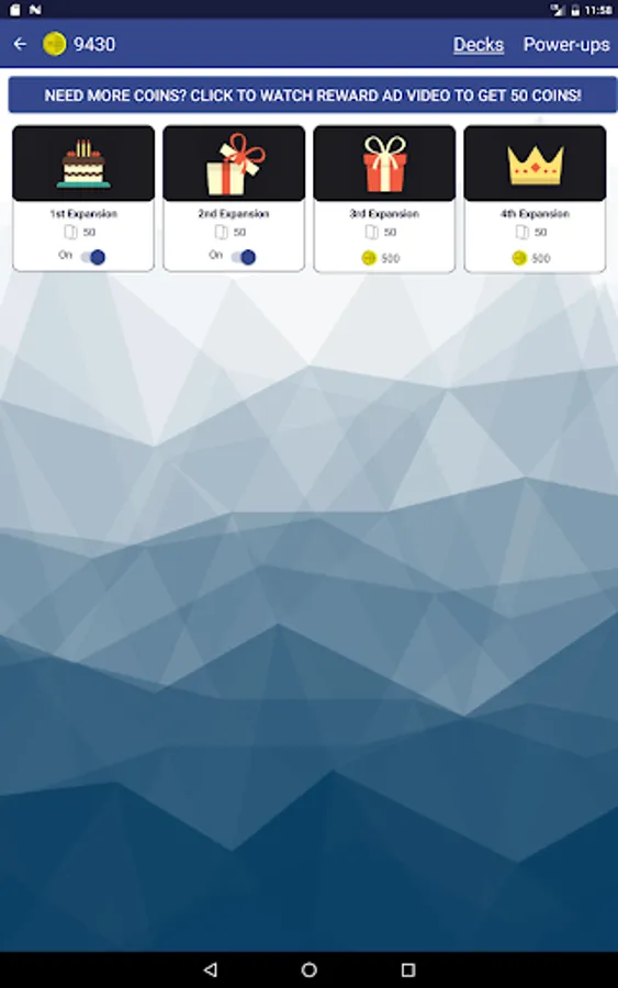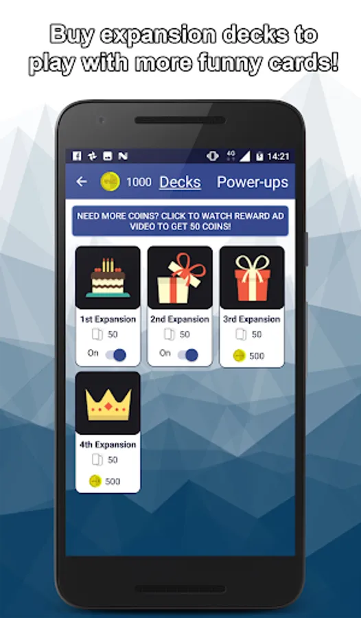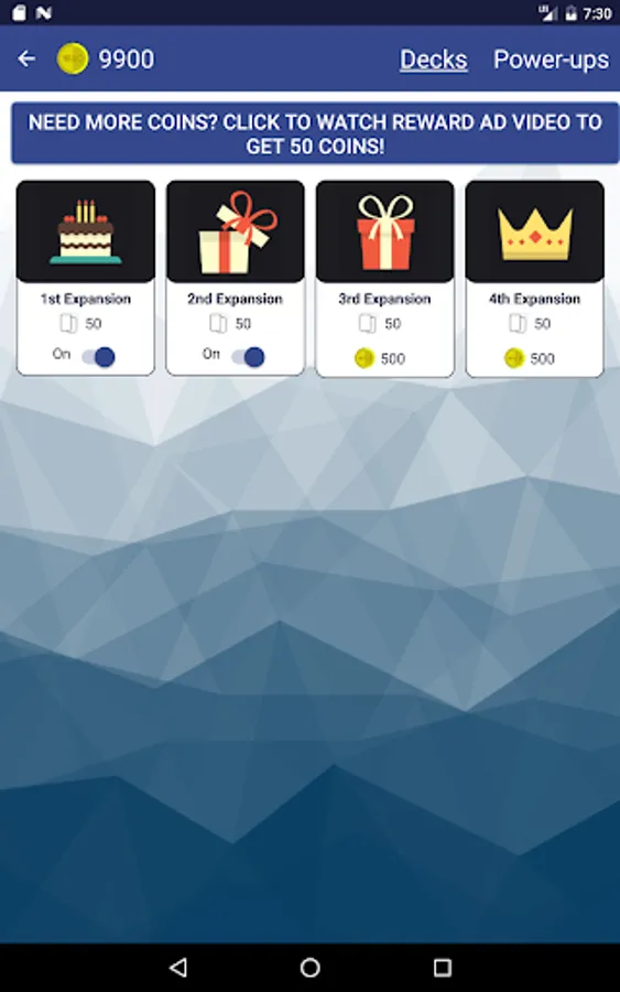 In the shop you can buy more card decks and use them to play cards vs humanity. You can see some of the cards and compare decks of cards against each other to buy the deck you like the most. New decks will be available soon and created from suggestions you have sent. Cards vs humanity or cards for humanity, you choose!