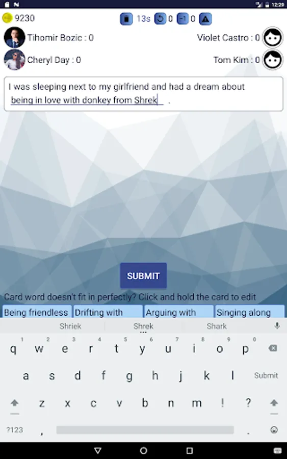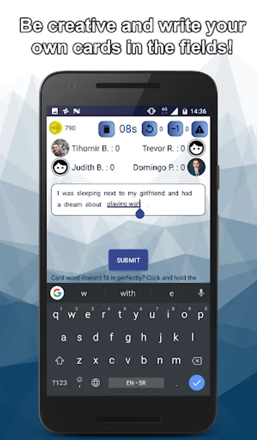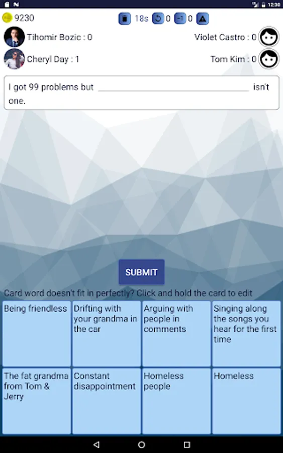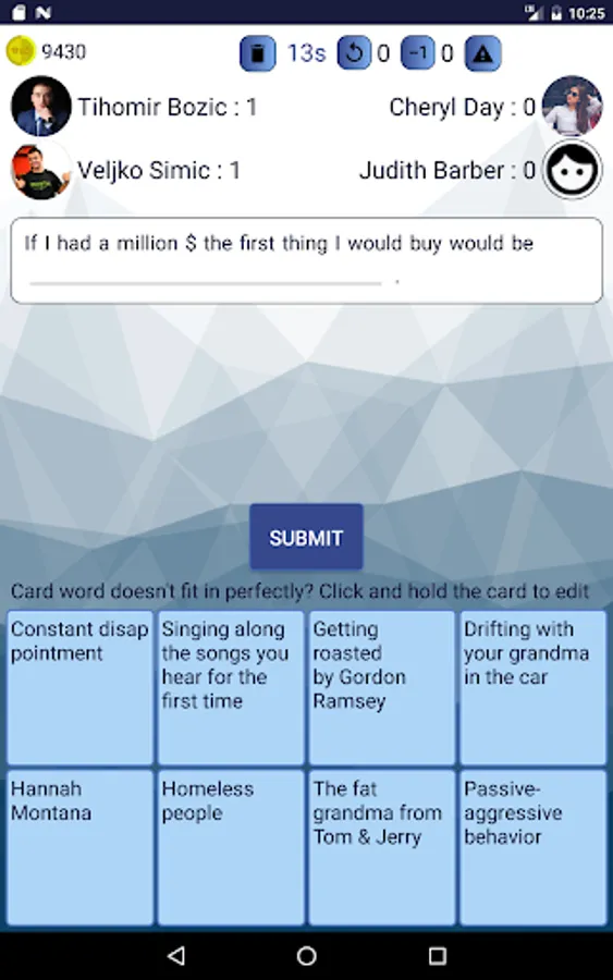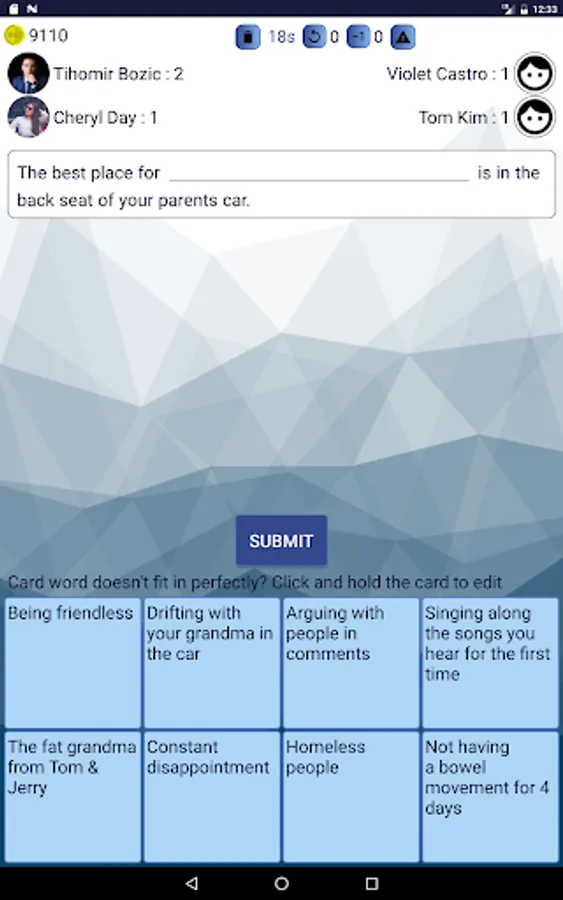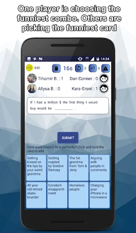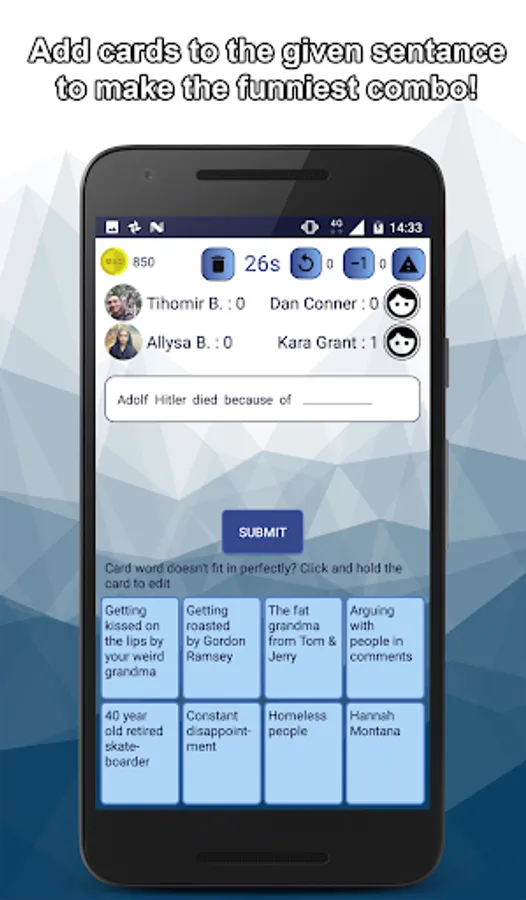 A card game in which the players are given the same question or statement card that they have to answer or fill in to make the funniest combination against humanity. Words Against Humanity allows you to play fun card game free online in which players use their cards against other players' cards to beat them making the funniest combination. Then one player compares combinations of the cards against each other and picks the funniest one. The first one who collects 5, 10 or 15 points is a winner! But remember, laughing hard is more important then winning! But eventually someone will prove to be the best cards vs humanity player.