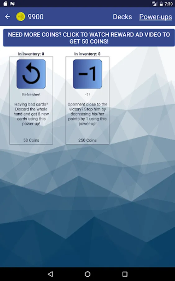 Watch short video ads and get coins you can use for playing or buying items in the shop.