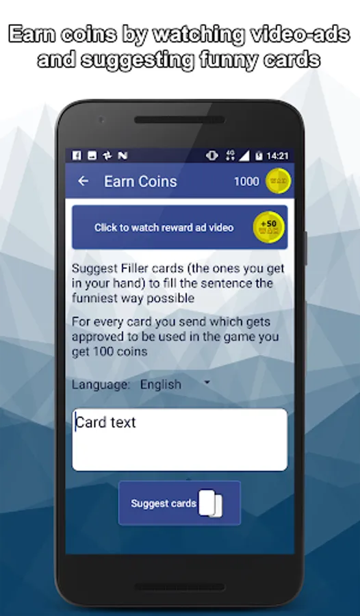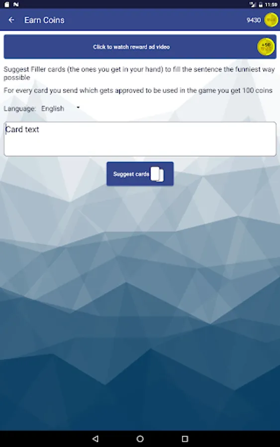 Suggest humanity cards for the game, as funny as you can, against humanity and win coins if they are accepted.