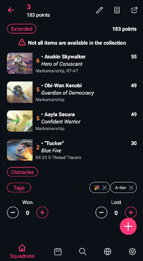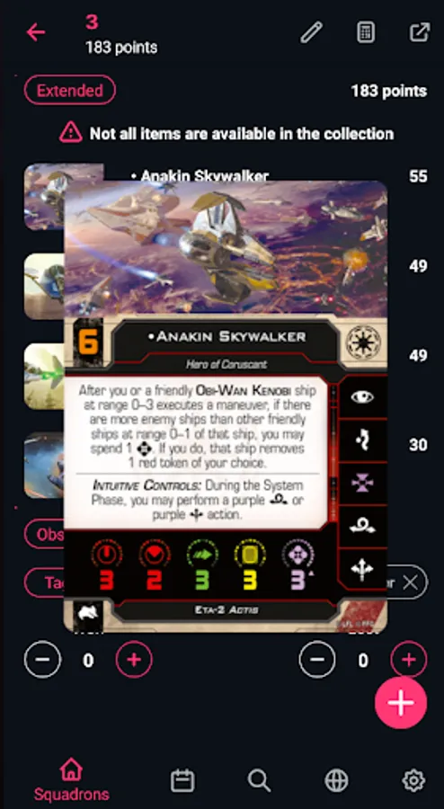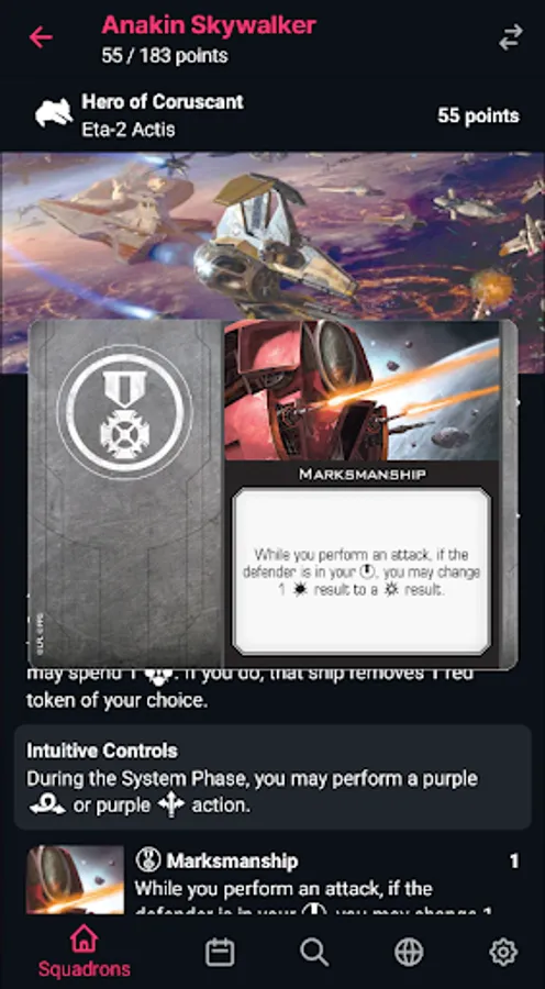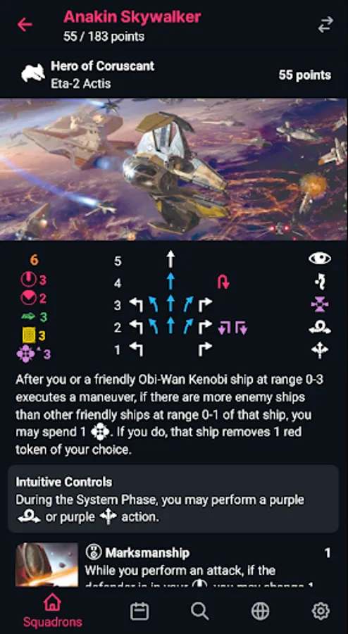 Launch Bay is a Squadron builder for X-Wing The Miniatures Game with a clean user interface, frequently updated (mostly over the air) and ability to save your squadrons in the cloud in case something happens to your phone!