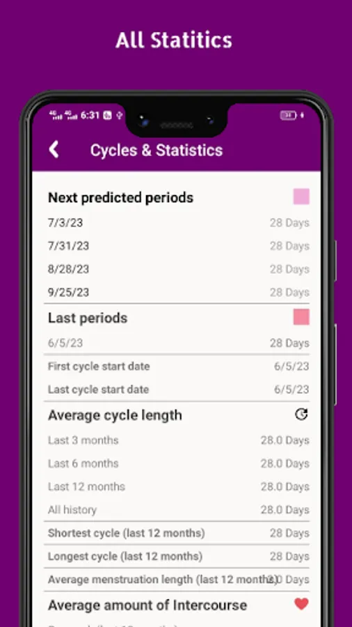 Menstrual Cycle Tracking: Keep track of your periods, including start and end dates, flow intensity, and symptoms. Stay informed about your cycle patterns and predict your next period with accuracy.