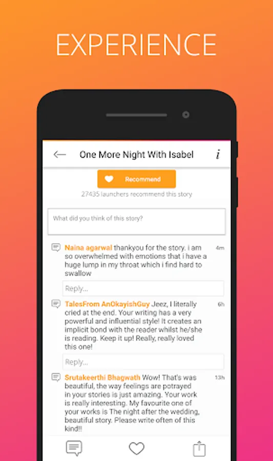 A writing and reading app where you can publish stories and poems. Launchora is a writing community for people who love to share and write poems, life stories, love stories, mystery, romance, screenwriting, fan fictions, confessions, letters, daily journals and more.