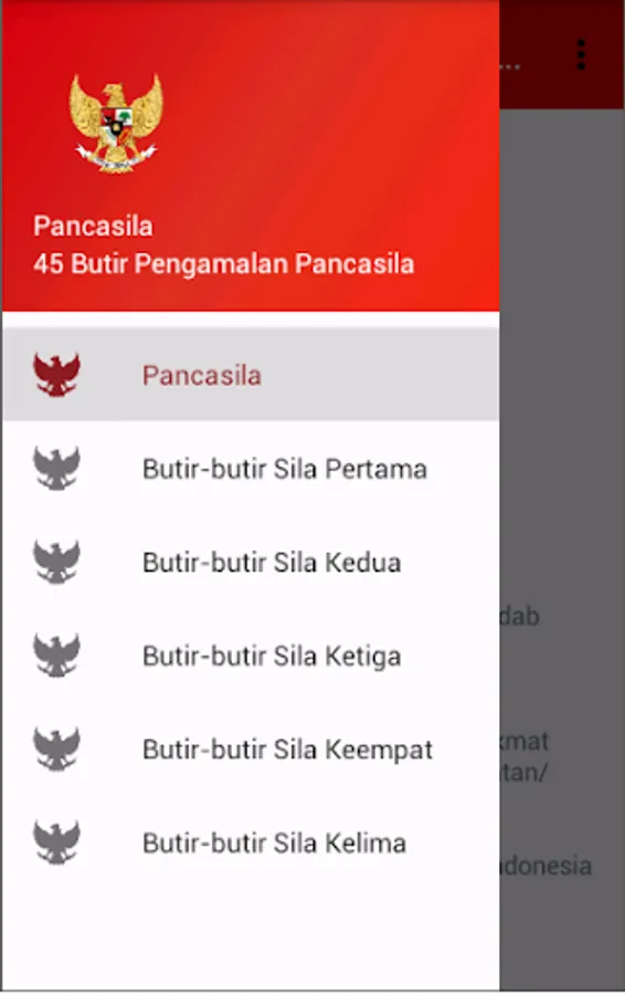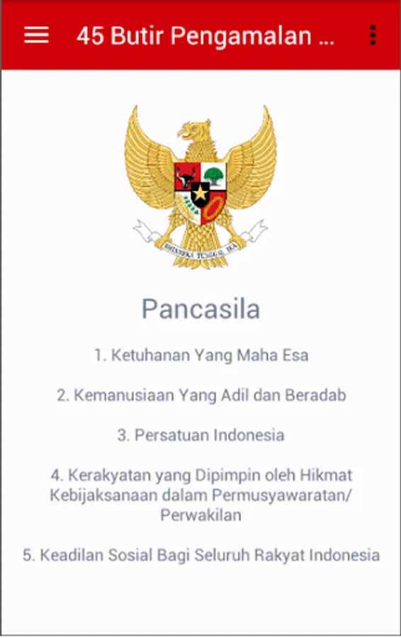 45 Item Pancasila Implementation is an Android app containing 45 grains of Pancasila. Pancasila is the ideology of the Indonesian nation. The values of Pancasila luur fitting to apply in everyday life. the application 45 Item Pancasila Implementation, you can learn the noble values based on Pancasila.