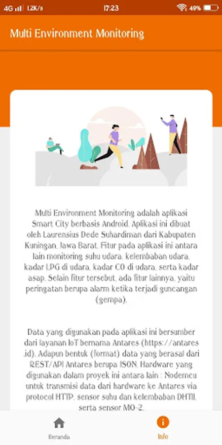 Multi Environment Monitoring is an Android-based Smart City application. This application was made by Laurensius Dede Suhardiman from Kuningan District, West Java. Features in this application include monitoring air temperature, air humidity, LPG levels in the air, CO levels in the air, and smoke levels. In addition to these features, there are other features, namely a warning in the form of an alarm when there is a shock (earthquake).