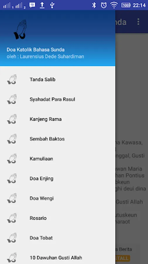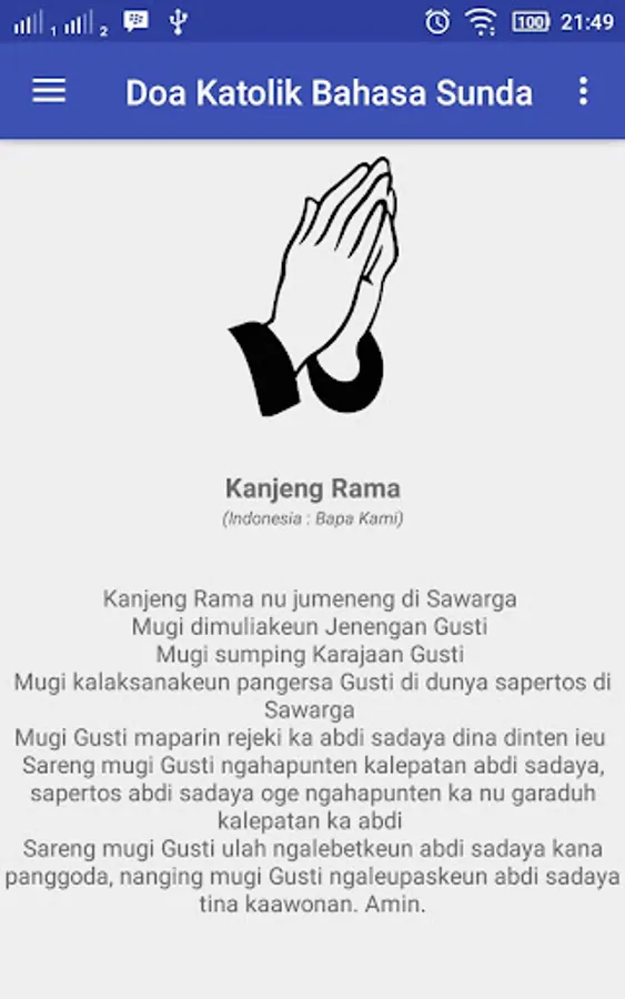 Catholic prayer Sundanese an Android application that contains the prayers of the Catholic religion presented in Sundanese. As these prayers like the Our Father, Hail Mary, a prayer evening, morning prayer and so forth.