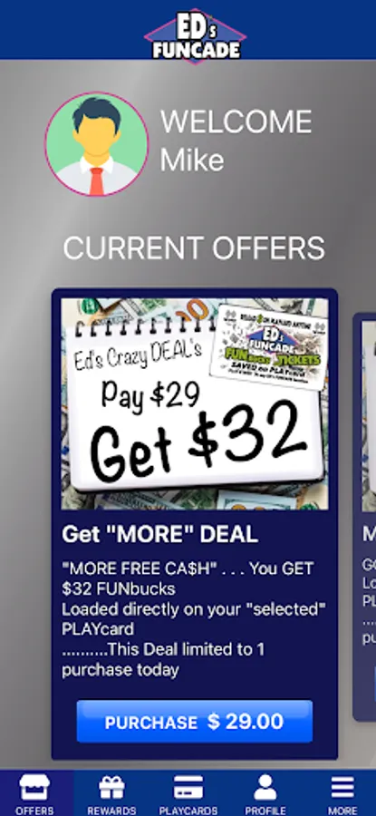 All you need to get started is your email, 1 or more Ed’s Funcade PLAYcards, and a valid credit card to securely enter within the app for “HOT DEAL$” only available to you with the Ed’s Funcade app.