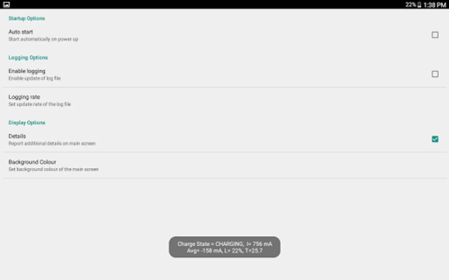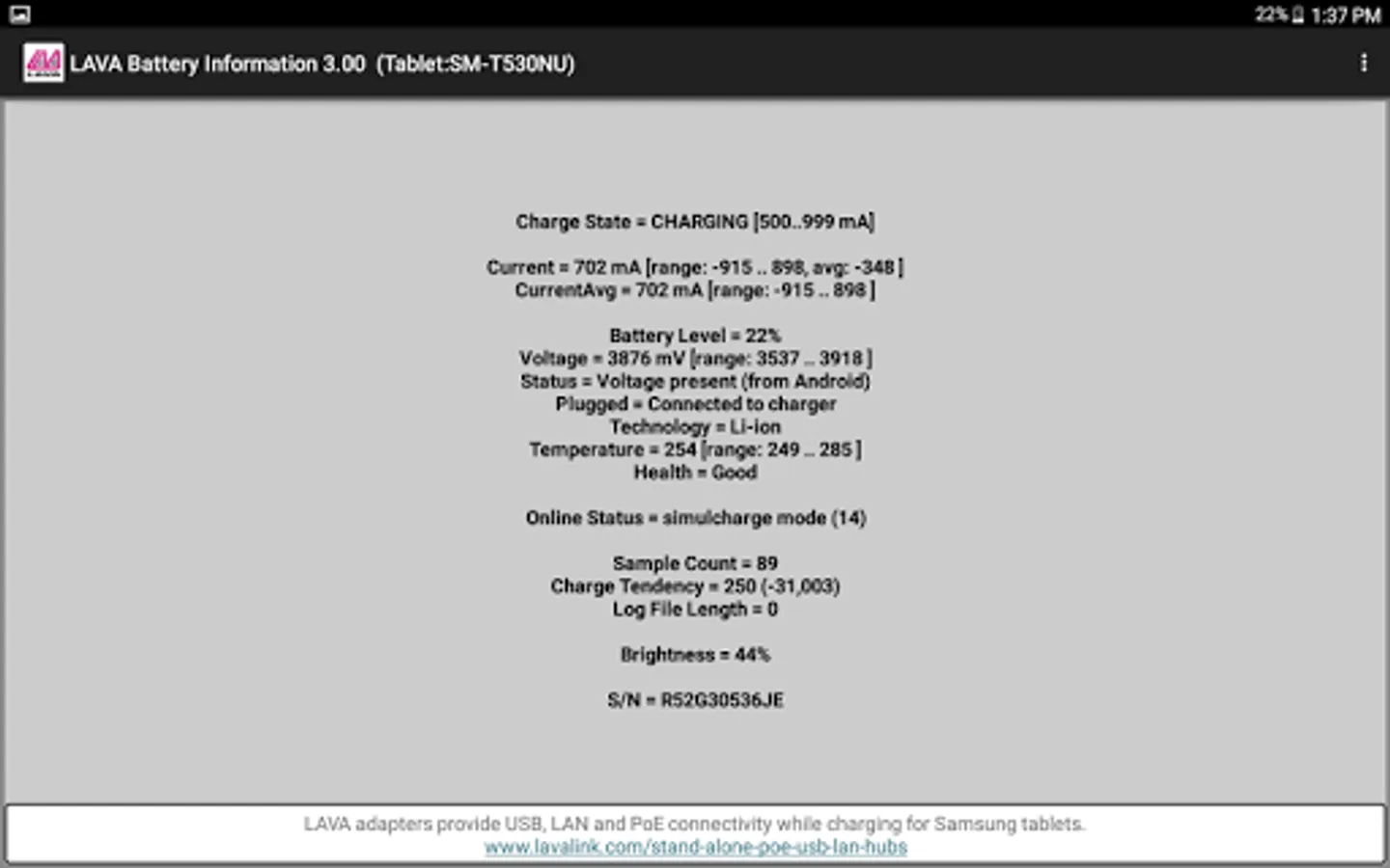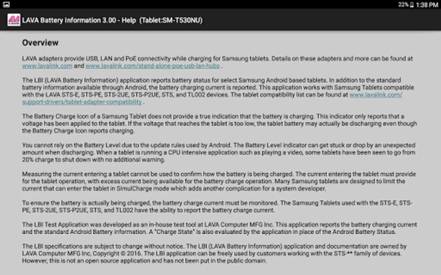 LAVA's free Android app monitors battery charge current as well as standard Android battery information to provide a much clearer and real-time understanding of how well the tablet is charging. You will be able to tell quickly if the tablet is DRAINING or CHARGING, and at what rate. This app is especially useful for developers of commercial tablet applications.