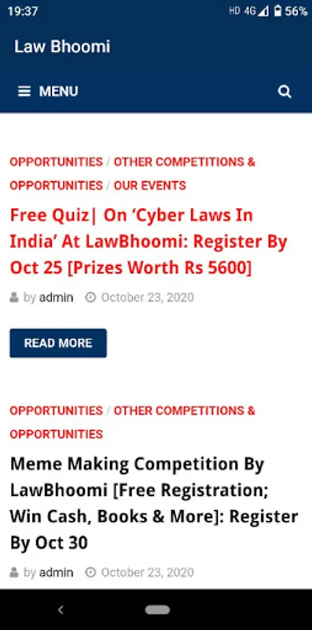An open access portal that caters to the needs of every law student and provides latest updates on legal opportunities, law notes, notes for exams, career guidance and interviews by eminent legal professionals. LawBhoomi has also taken the initiative of conducting free legal competitions for law students to acknowledge and reward their skills. The various online competitions that are regularly being organized by LawBhoomi include quizzes, essay writing, CV drafting, case summary writing, poster making competitions etc.