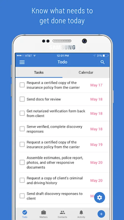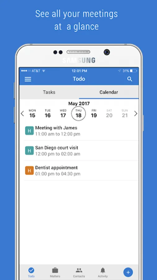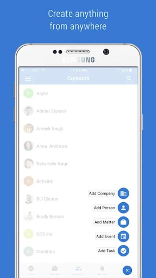 ● Global add button to quickly add tasks, meetings, contacts and matters.