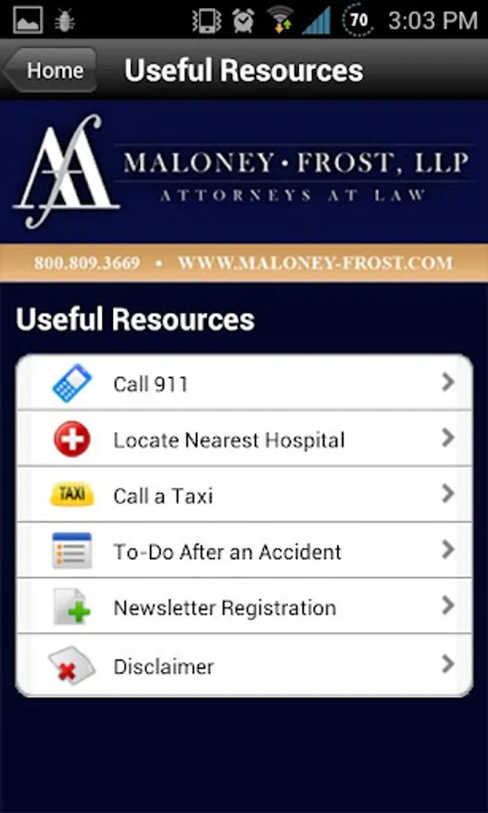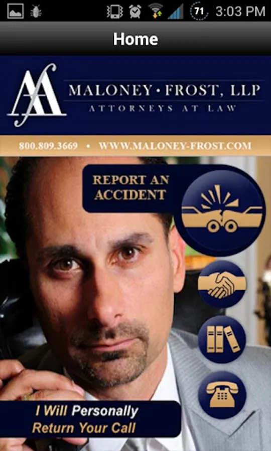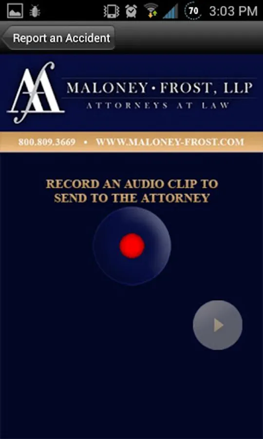 The Maloney-Lyons App is a useful utility for people involved in an automobile accident. Save and retain all important information from the accident scene, gather and store all important contact and insurance information, take and store pictures, record an audio description, and capture the exact map coordinates of where the accident took place. Then, instantly send those to an attorney in your area who can review the information and respond immediately.