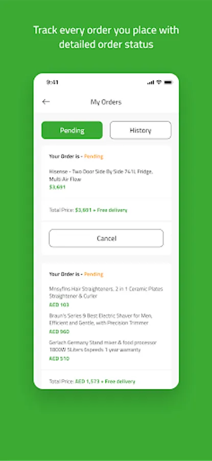 The app also includes a detailed status page where you can see all of your orders at a glance.