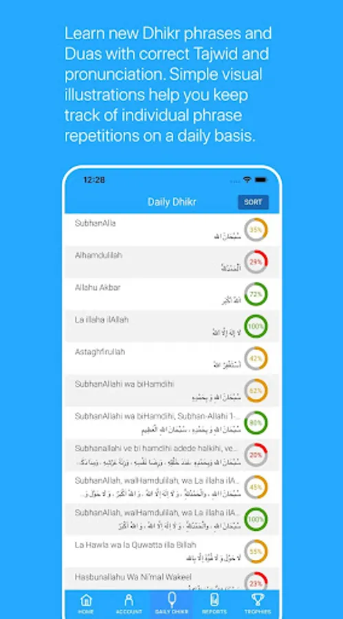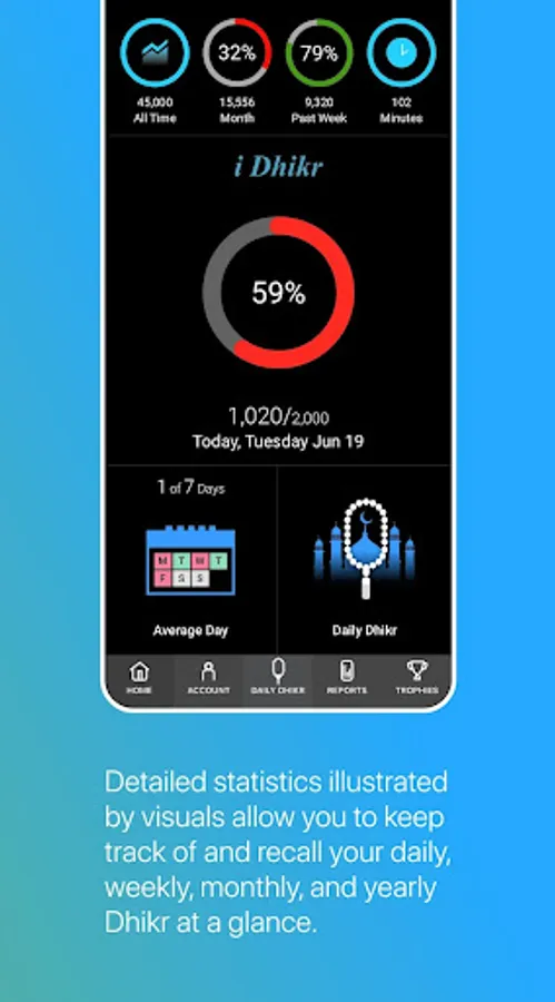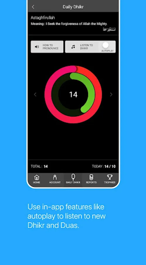 The interface and look are very important feature in every app which will interact you with app. There is no lengthy work in app just select dhikr and click on count button. You can save your record which you can continue next time. Just run this app using email to save your record. In home screen you can see how many times you tasbeeh dhikr. The unique features of this app which will allow you can also add any dhikr which is not already save in app. In trophies section you can also see your level which is based on your performance.