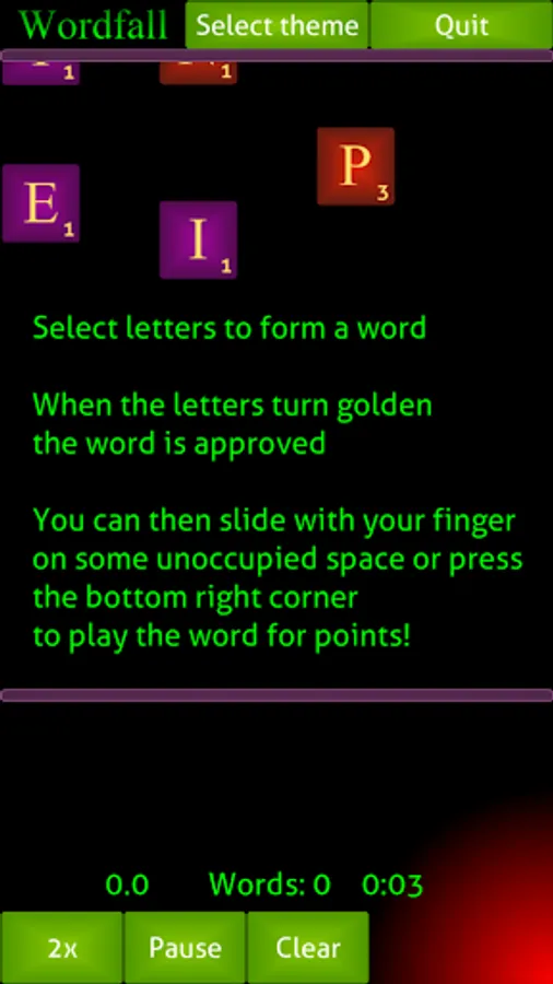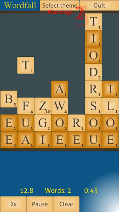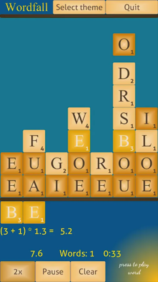 New letters keep coming and you have to use them to create words, longer words are worth more points. If the screen fills up with letters the game is over. For each passing minute the rate of new letters increases!