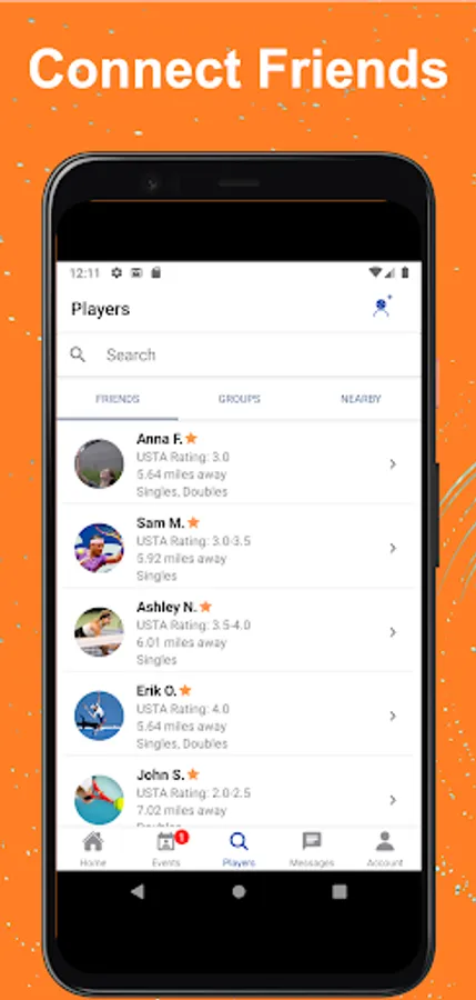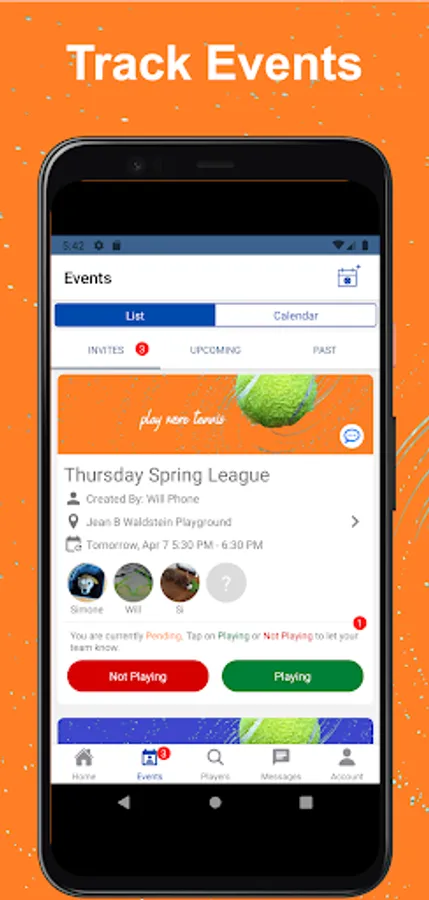 The Tennisphere App lets users find and connect with local players, organize players into Friend and Group Lists, schedule Events and Teams, and foster tennis in their communities.
