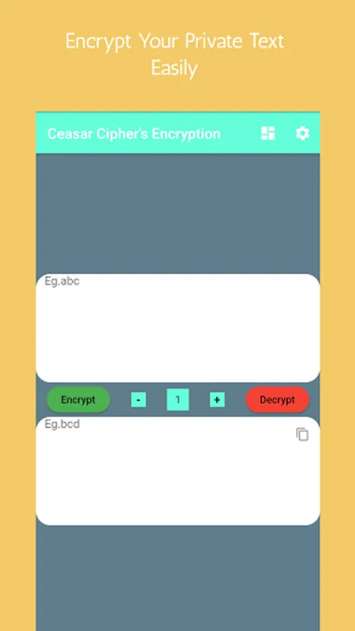 This is a simple Ceasar Cipher's Encryption, the first shift encryption method created by Ceasar.Simply this is shift the word from your elegant button number, if you want to two shift you can increase number of elegant number and encrypt.