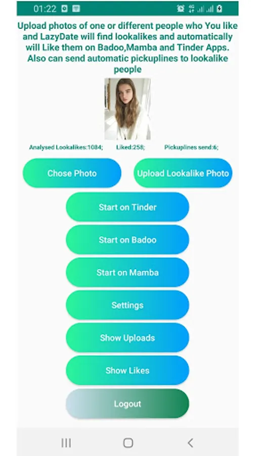 LazyDate is an app that works with face recognition. You upload photos of people You think are attractive to You and LazyDate will start to analyse Bad_oo ,Tin der or Mamba app profiles and if profiles photos have any face similarities with photos that You have uploaded than LazyDate will automatically like (swipe Right) this profiles and if necessary it also can send automatic pickuplines.