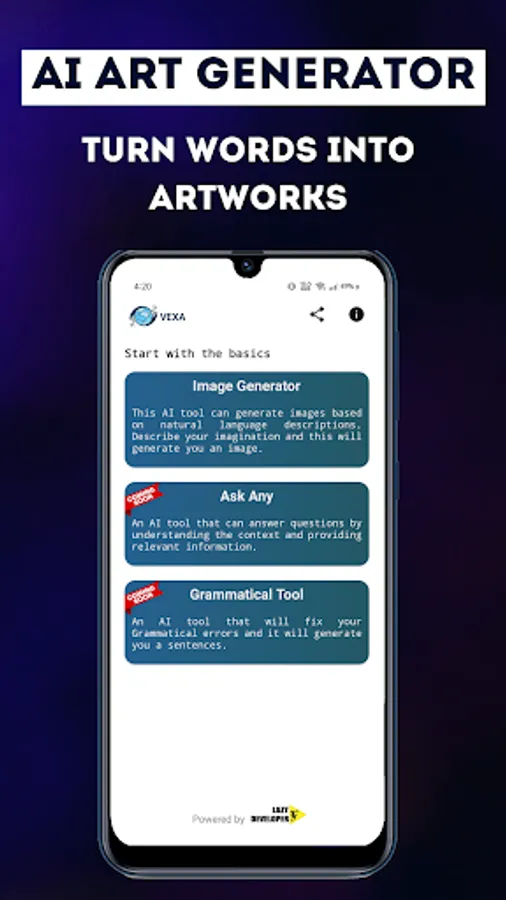 VEXA is an image generator AI type of artificial intelligence system that is designed to generate images based on a set of input parameters or described text.