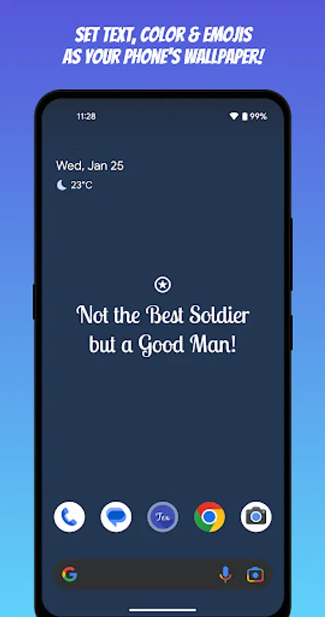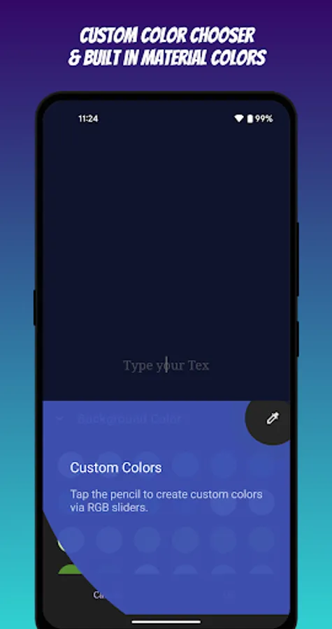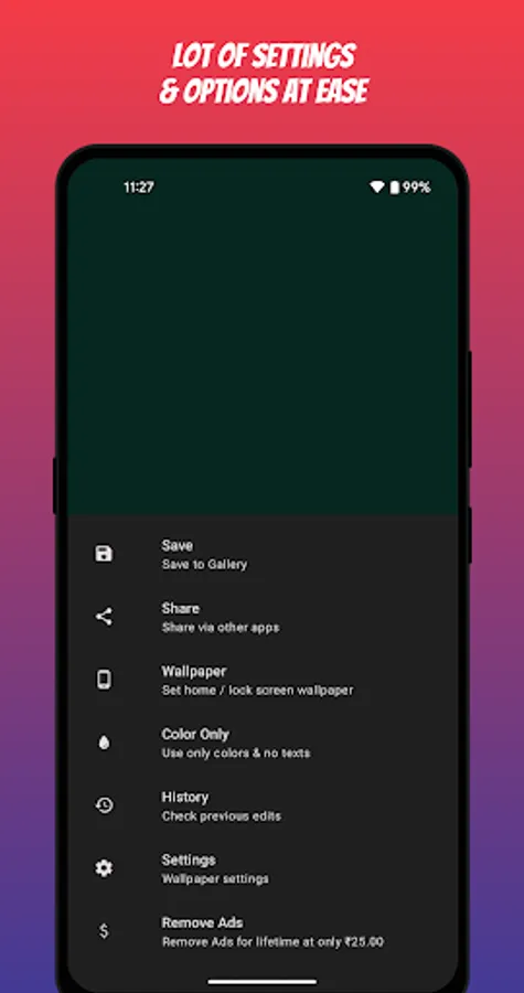 With the material design colour palette and custom colour chooser, the possibilities are endless. The automated colour mode feature changes your wallpaper with random or material colours on selected intervals. Keep track of all your creations with the History feature and even add emojis and smileys.