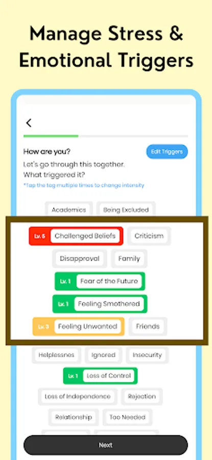 -identify negative and distorted thinking patterns to change your emotions and your behaviors for the better. Tochi has a feature called Emotional Triggers where we can help you manage your panic attacks and you can record what is really causing your anxiety to look back and analyze in detail.