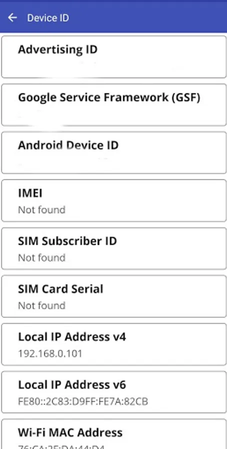 Simple app to get your Android Device ID, IMEI, MAC Address and more.