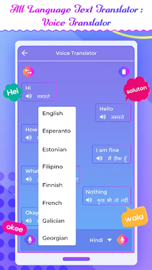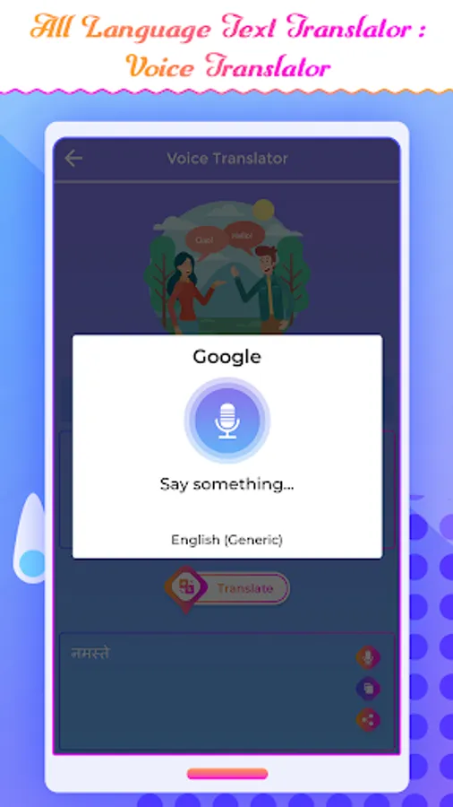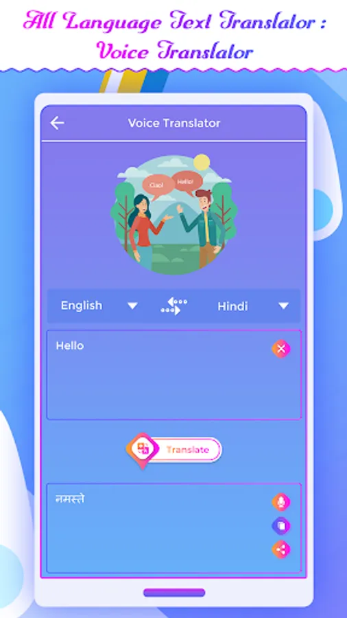 All Language Text Translator - Voice Translator app which allows users to instantly translate your words into another language. Application has main two translators like voice translator, all language translator. Use this Voice Translator to instantly translate any text into many more languages!. Just tap on mic and it will write your text with meaning.