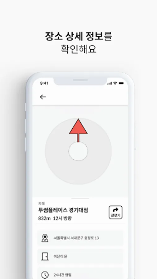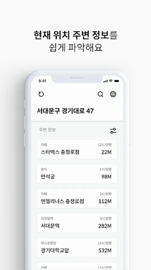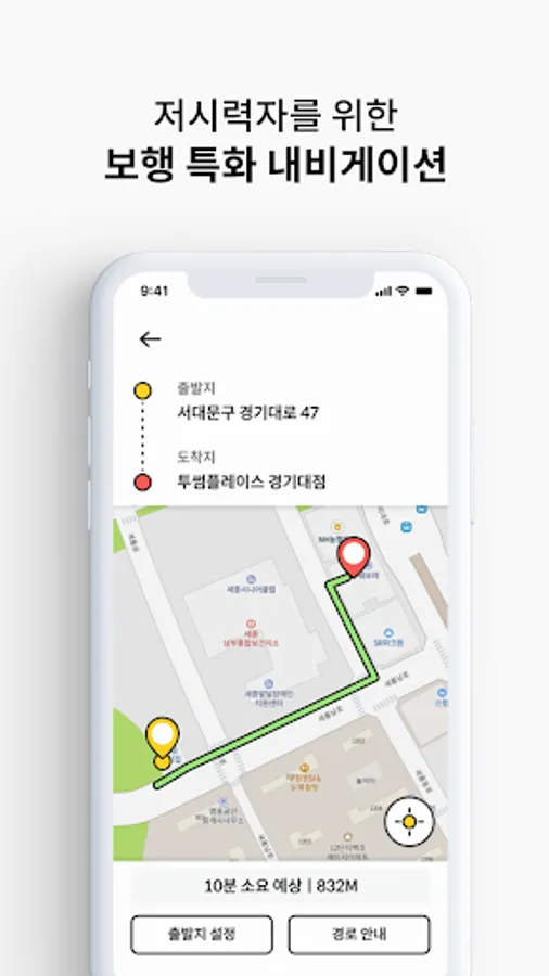 It guides the walking path optimized for the visually impaired in the app usage environment that considers the low-vision visually impaired. You can quickly access information on nearby facilities (cafes, convenience stores, toilets, subways, bus stops, etc.) focusing on your current location, and get to your destination safely through accurate direction information and entrance information.