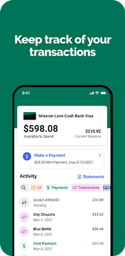 With the Mission Lane iPhone app, you can manage your credit card account any time, anywhere. Check your account balance, pay your bills, view your activity, or keep tabs on your credit score - all at the tap of a screen.
