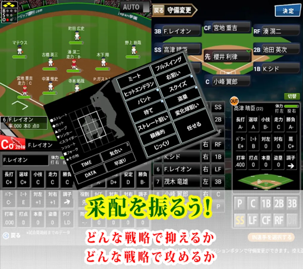 Grasp the characteristics of the player and win by making full use of the best strategy from 13 types of defense + defensive position, 15 types of attack such as "strike out", "runner warning", "stay away", "slug aim", "stealing base", "bunt", etc. please.
