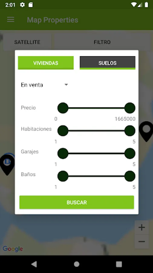 VerdeSueloApp is an application that allows you to locate and check the availability of properties and land for acquisition and use. It offers the possibility of filtering according to the characteristics of the property (price, sale or rent, number of rooms ...).